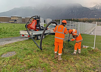 Per Vakuumsystem – wie das Modell Ditch Witch FX65 – wird das Fräsgut im selben Arbeitsgang abgesaugt. Ein Vorteil, nicht nur für die Anwohner, die nicht durch lästige Staubentwicklung und herumliegendes Fräsgut belästigt werden, sondern auch für die Mitarbeiter der beauftragten Firma Störmer Bau, die kaum Nachräumarbeiten haben und sich ganz mit der Verlegung der Breitbandleitungen sowie der Wiederherstellung der Oberfläche beschäftigen können.
