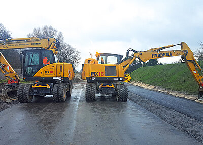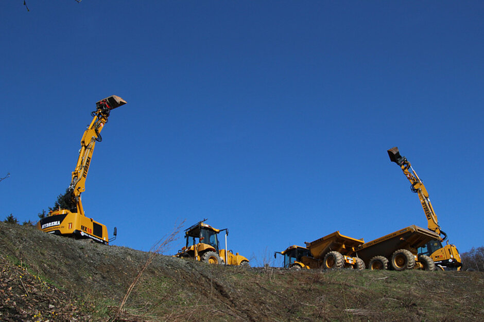 Als Hauptattraktion der Ausstellung waren die HYDREMAs deutlich wahrzunehmen. Schon vom Parkplatz aus sah man von unten hoch auf die ersten Vertreter des Dänisch-Deutschen Premium-Herstellers. Zwei der 5 ausgestellten MX – Bagger standen am Schütthaufen zur Verfügung und konnten, was auch ständig der Fall war, von den Kunden dort ausgiebig getestet werden. Auch die Dumper waren natürlich sehr beliebt, denn mit ihnen konnte man eine abgesteckte Teststrecke im Steinbruch entlang fahren. Natürlich wurden die Dumper von den MX – Baggern beladen, so dass man die Fahrt voll beladen, oder auch leer machen konnte. In jedem Fall haben die Dumper bewiesen, dass sie wahre „Kletterziegen“ sind, denn vor großen Steigungen muss man mit einem HYDREMA – Dumper keine Angst haben. HYDREMA – Dumper zeichnen sich aus durch ihr geringes Eigengewicht, den hohen Fahrkomfort, die robuste und solide Bauweise und die Lebendigkeit im schweren Gelände. Und der MX – Bagger, der aufgrund seiner extrem kompakten Abmessungen von HYDREMA als City-Bagger vorgestellt worden ist, bewies seine Vielseitigkeit und zeigte auch andere besondere Eigenschaften. „Der MX gilt als kräftigster Bagger seiner Klasse. Nicht umsonst demonstrieren wir die Hubkraft mit einem 8 to. Gewicht, dass der MX 18 komplett schwenken und auch verfahren kann. Dabei stellen die 8 to. noch nicht einmal den Grenzwert dar“, erzählt Regionalleiter Markus Fleisch von HYDREMA. „Ein HYDREMA – Fahrer zeigt immer gerne, was man mit einem HYDREMA machen kann. Ich habe hier sehr viele Kunden getroffen, die noch den Vorgänger des MX fahren und sie erzählten mir stolz, dass sie mit dem alten HYDREMA viel schneller sind, als andere mit ihren neuen Maschinen.“ Und tatsächlich ist der neue MX aufgrund seiner Hub- und Schwenkkraft enorm bissig und kräftig, wenn es darum geht, den Löffel voll zu machen. Gino Götz, der HYDREMA – Fachmann von DiTec ist ebenfalls ganz happy. „Hier können sich unsere Kunden ganz ungezwungen mit dem HYDREMA auseinandersetzen. Und wenn sie erst mal in der Kabine, übrigens die mit Abstand größte in der Mobilbaggerklasse bis 20 to., drin sitzen, dann springt der HYDREMA – Virus ganz schnell rüber. Die Kraft und Feinfühligkeit überzeugen. Wir haben bei Vorführungen mit dem MX18 bewiesen, dass wir mehr heben und bewegen können, als andere mit Ihren 20 to. Langheckbaggern und deshalb auch verkauft.“