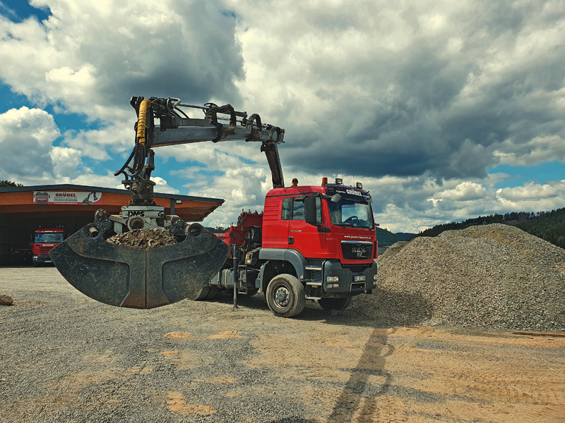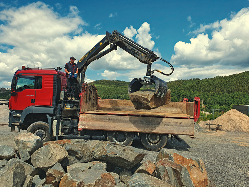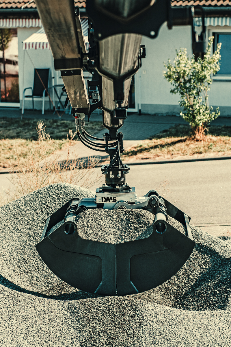 Typisch für die Produkte der DMS Technologie sei ihre sehr hochwertige Verarbeitung, lobt Holger Grübel weiter. Die niedrige Bauform sei besonders vorteilhaft, gerade beim Arbeiten direkt an der vorderen Ladebordwand. »An der Stirnwand des Kippers kann man dadurch das geladene Material sehr gut erreichen. Die Produkte liefern mir in meinem Unternehmen einen hohen Mehrwert, unter anderem durch die tagtägliche Zeitersparnis. Manchmal können wir uns sogar einen Bagger auf der Baustelle sparen, da beim Verladen ähnliche Geschwindigkeiten wie mit einem Kompaktbagger zu erreichen sind«, so der Geschäftsführer. Besonders überrascht habe ihn beim ersten Einsatz der DMS-Greifer die sehr feinfühlige Ansteuerung der Hydraulikkomponenten. »Die Greifer lassen sich fantastisch steuern, und die Hydraulik reagiert prompt und zuverlässig. Wichtig ist bei unseren Arbeiten auch die besonders starke Schließkraft, sonst könnten wir keine 2-t-Steine heben«, betont Grübel weiter. t