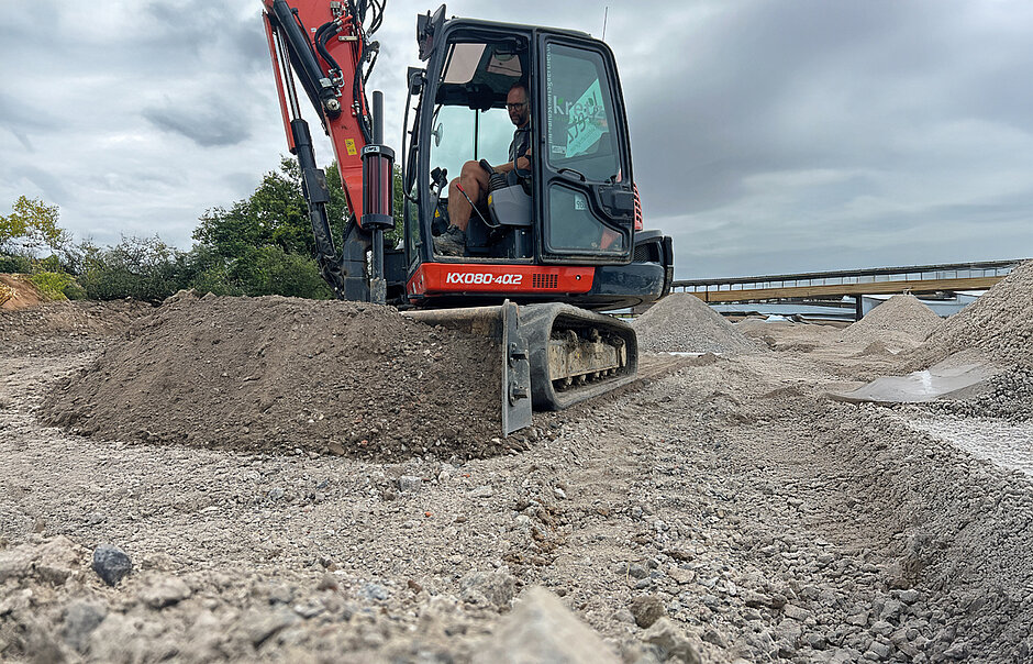 Sebastian Kretz weiter: »Früher standen drei Leute mit Flachschaufeln daneben, um die Höhe zu prüfen. Heute macht das der Bagger – und zwar alleine. Ich transportiere das Material wie gewohnt mit dem Bagger und planiere anschließend direkt die Fläche. Das spart Personal und Zeit.« Wie intuitiv das System funktioniert, zeigt sich bei seinem Mitarbeiter Philipp, frisch ausgelernter Landschaftsgärtner ohne große Baggererfahrung: »Ich drücke einen Knopf, bringe das Schild grob in Position und der Rest läuft automatisch. Ich muss nur noch fahren. Das funktioniert super – auch ohne jahrelange Erfahrung.«