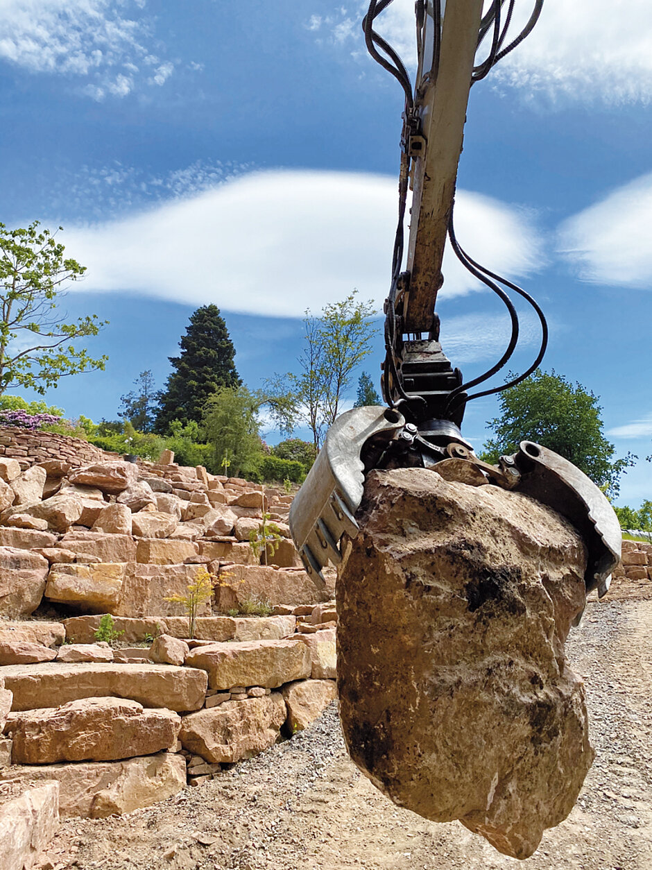 Besonders wichtig ist ihm bei der Arbeit, die Steine sicher halten zu können. »Wir versetzen Quader von 1,5 t bis 2 t beim Bauen von Stützmauern in große Höhen mit hoher Sicherheit. Besonders wichtig ist uns die Präzision und Feinfühligkeit bei der Ansteuerung des Anbaugerätes, da wir die mehrere Tonnen schweren Steine beim Aufeinandersetzen zentimetergenau platzieren müssen. Wir sehen dort einen deutlichen Unterschied zu Greifern anderer Hersteller«, betont Robin Stangenberg. t