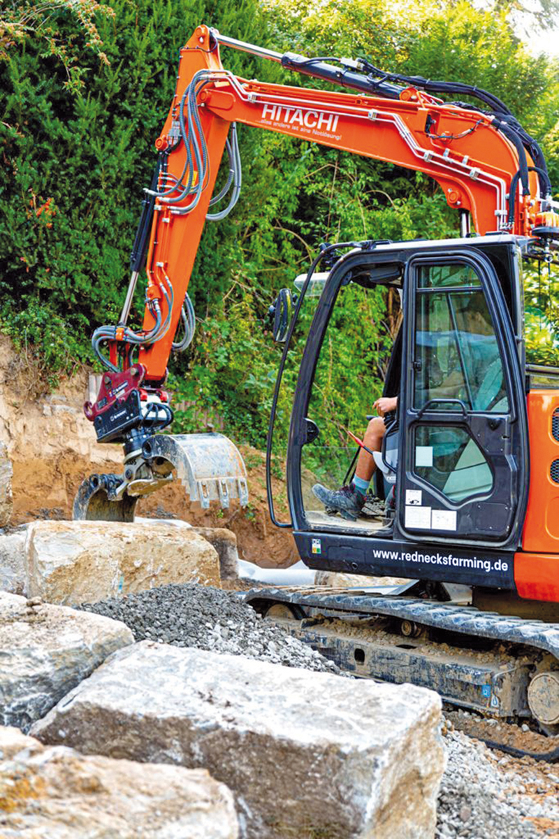 Auch das Unternehmen Rednecks Farming aus Heppenheim (Bergstraße) setzt den DMS-Sortiergreifer bei nahezu jedem Arbeitseinsatz ein. Der GaLaBauer hat sich auf die Gestaltung von Pool-Anlagen spezialisiert, wofür regelmäßig große Stützmauern aus Natursteinquadern gesetzt werden. »Wir schätzen am DMS-Greifer, dass wir durch die kompakte und gekapselte Bauweise in jede Grube und jede Ecke hineinkommen, ohne die Gefahr, dabei Schläuche abreißen oder die Kolbenstange beschädigen zu können«, erläutert Inhaber Robin Stangenberg. Bei der Arbeit mit großen und schweren Blockstufen sowie Natursteinquadern sei dies essenziell.