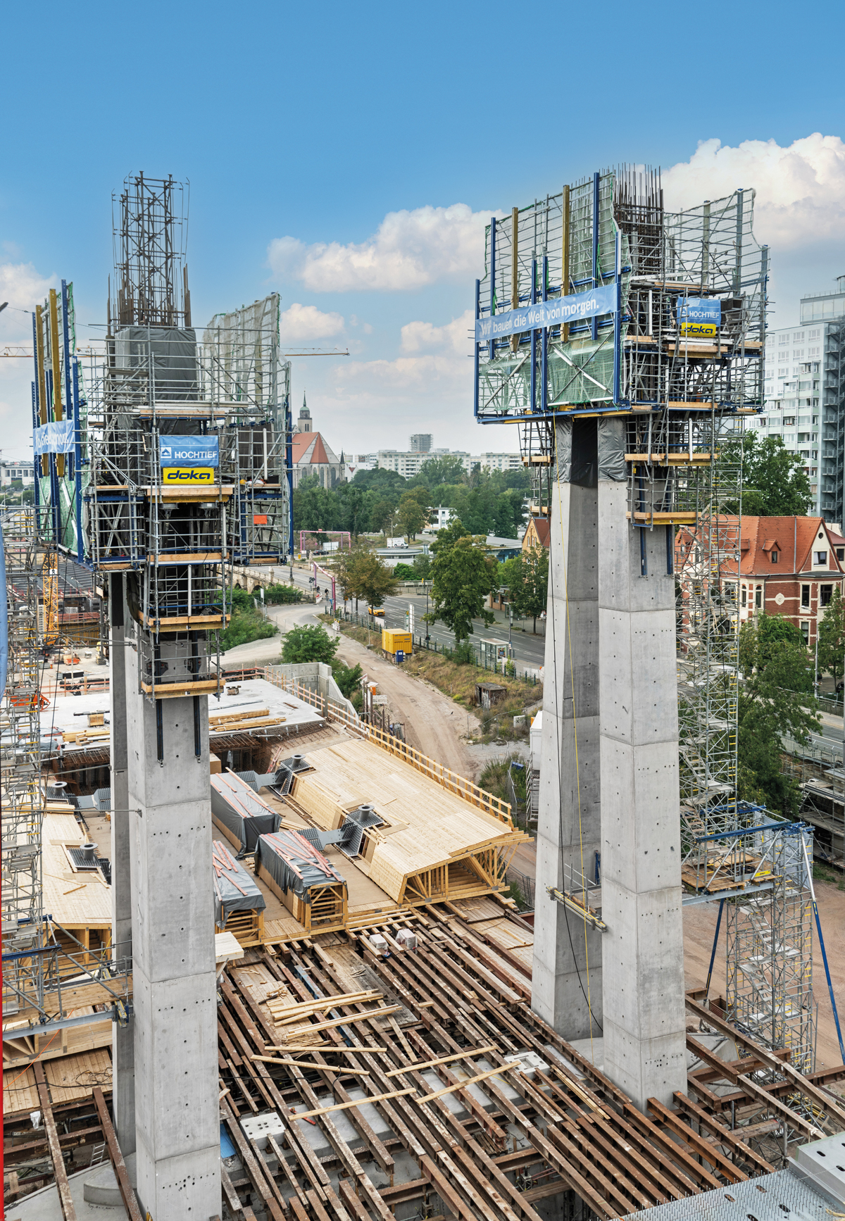 Ein weiterer Pluspunkt, den Doka als einer der wenigen Schalungshersteller anbietet, ist die Schalungsvormontage. Die Vormontage der Wandelemente zu transportierbaren Einheiten erfolgte bereits im Doka Fertigservice Dresden. Edgar Feist erklärt dazu: »Die Trägerschalungselemente haben wir in Abstimmung mit der Baustelle getrennt vom Selbstklettergerüst mit dem Kran umgesetzt. Durch das Zwischenlagern konnten wir die Elemente schnell und flexibel an die Geometrie des nächsten Betonierabschnitts anpassen.« Die Selbstkletterschalung für die Pylone wurde vor Ort vom fachkundigen Team der Doka Schalungsvormontage vorbereitet – und später auch wieder demontiert. Die Konstruktion besteht aus dem System SKE100 plus in Kombination mit einem Fachwerkgerüst zur Bühnenausbildung. Pro Betonierabschnitt klettert das gesamte System per Hubhydraulik um 5 m in die Höhe. Die fest eingebauten Arbeitsbühnen müssen dafür nicht umgebaut werden, da Dokas Techniker spezielle Gleitlager geplant haben, die sich automatisch an die Geometrie jedes Betonierabschnitts anpassen. Die zugehörige umlaufende Einhausung sorgt dafür, dass die Baustellenmannschaft selbst in großen Höhen sicher und komfortabel arbeiten kann. Komfortabel deshalb, da an der Einhausung des Klettergerüsts speziell klappbare Arbeitsbühnen angebracht wurden, die für die Arbeiten sowohl an der Schalung als auch der Bewehrung, ein Freiraum von 1,50 m, in zwei unterschiedlichen Abständen zum Bauwerk variabel waren.d