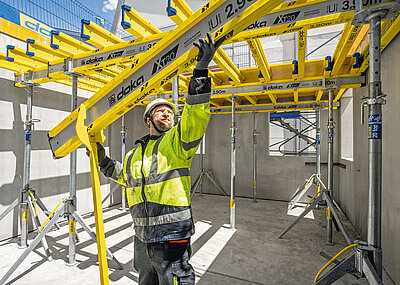 Die mitwirkenden Unternehmen – Edge als Entwickler, Züblin als ausführende Baufirma, Alcemy als Technologieunternehmen und Doka als Schalungsexperte – haben bereits beim »Edge East Side« zusammengearbeitet. Wie bereits beim Highrise-Projekt an der Warschauer Straße kommen auch beim »Edge Friedrichspark« Dokas bewährte Decken- und Wandschalungssysteme zum Einsatz, so etwa 4 500 m2 der »DokaXdek«-Tische. »DokaXdek« ist das neueste Deckenschalungssystem von Doka, das vielseitig einsetzbar und kombinierbar sowie äußerst langlebig ist und dabei mit besonders viel Sicherheit und Wirtschaftlichkeit punktet.