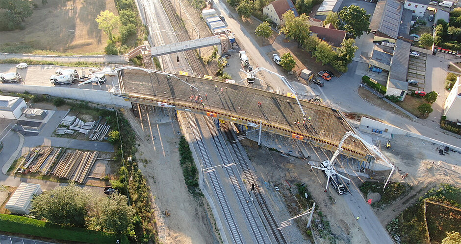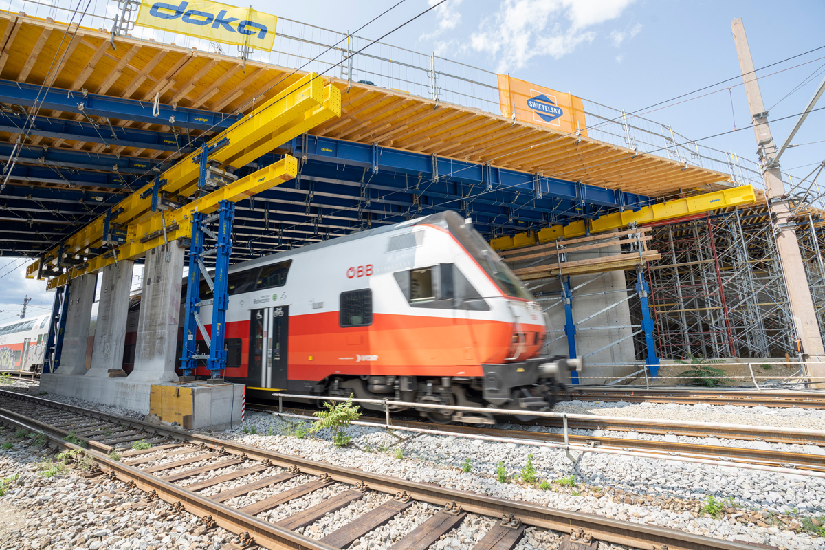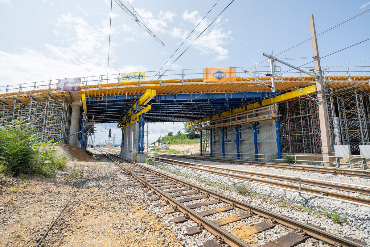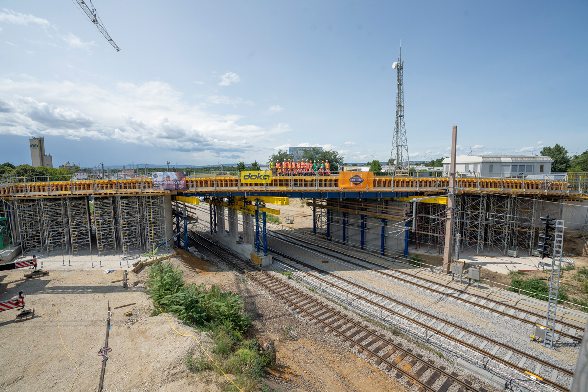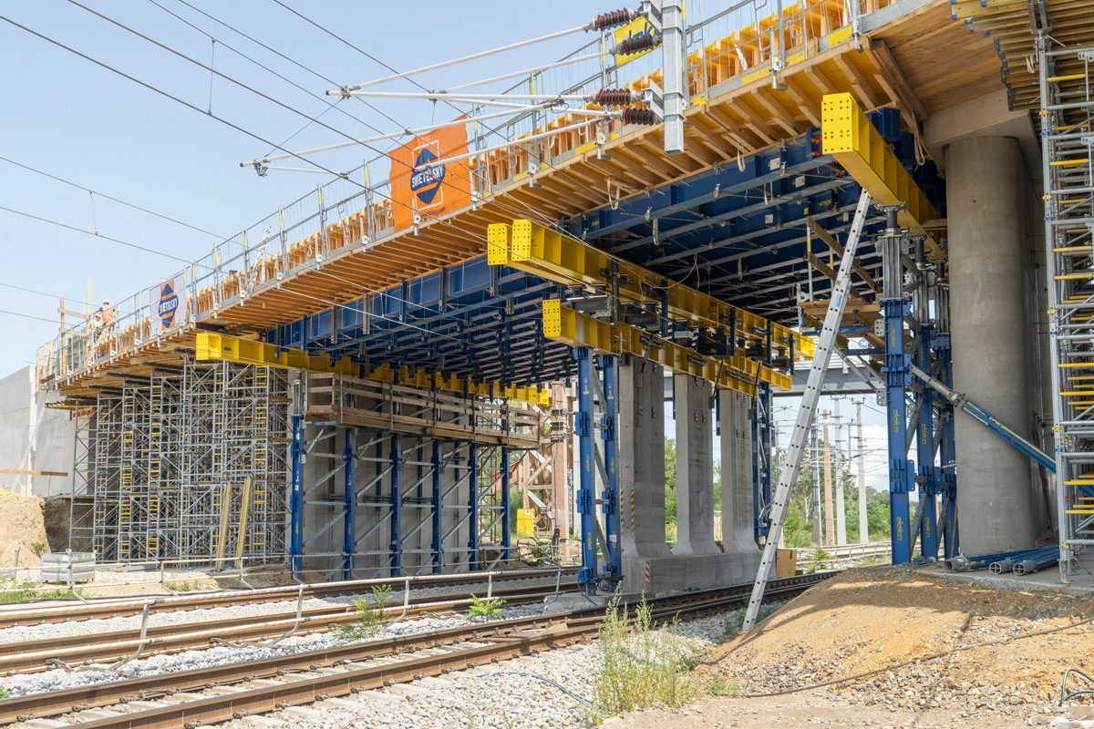 Die neue Brücke, die die Nordbahn-Strecke überspannt, wurde an die geänderten Dimensionen angepasst. Nach dem Abbruch der alten Konstruktion errichtete die Baustellenmannschaft Doka zufolge mit der Rahmenschalung Framax Xlife zwei Widerlager und drei Brückenpfeiler. Für die Herstellung der Rundungen der 13,48 m langen und 100 cm dicken Pfeiler kam zudem die Stützenschalung RS zum Einsatz. Die Schalungshöhe betrug bis zu 8,70 m.