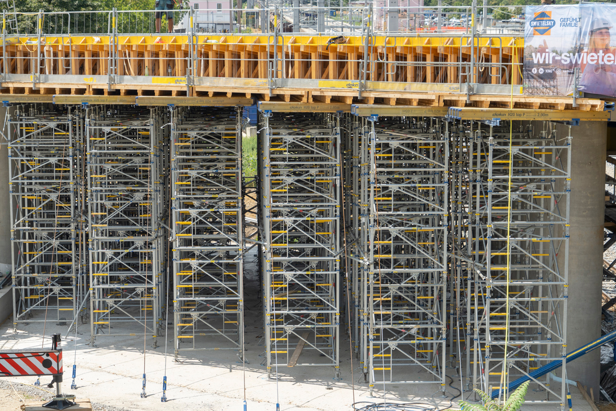 Doka sorgte mit ihrem umfangreichen Produktsortiment nach eigenen Angaben für die zuverlässige und clevere Unterstellung des massiven neuen Tragwerks mit einer Länge von 83 m und einer Breite von 15 m. Die Tragwerkstärke variierte von 1,25 m im Regelbereich bis zu 1,75 m an den Pfeilern. In den Widerlagerzonen war als Unterstellung das Traggerüst Staxo 100 mit seinen robusten Stahlrahmen im Einsatz.