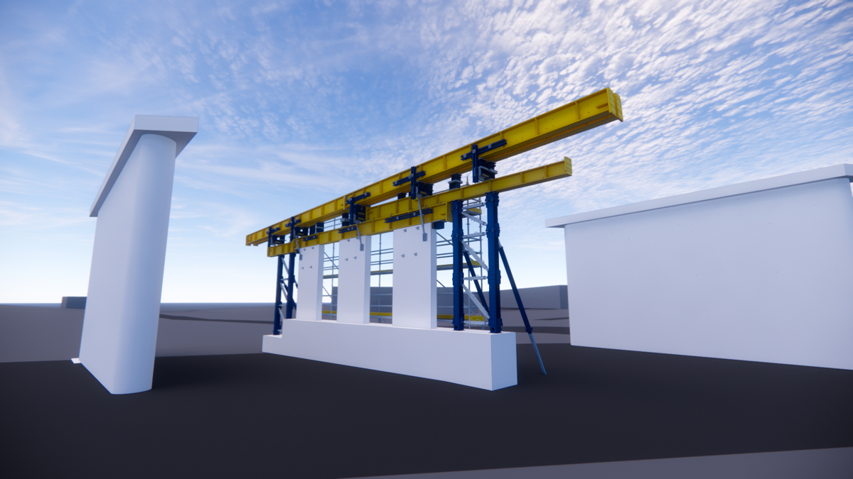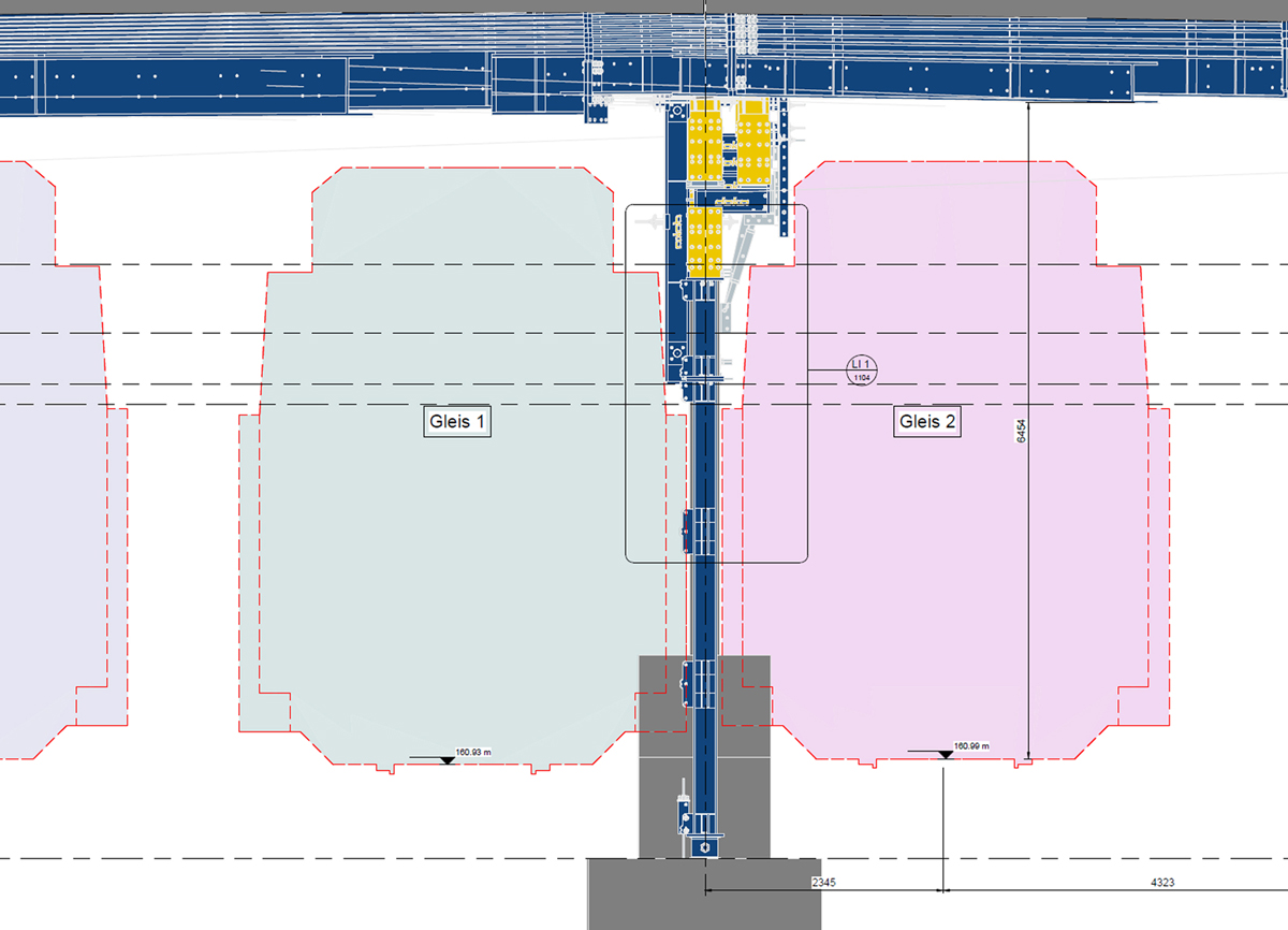 Eine besondere Herausforderung bei diesem Bauvorhaben stellte die Einhaltung des Lichtraumprofils dar, das für den ungehinderten Zugsverkehr freigehalten werden musste. Denn außerhalb der kurzzeitigen nächtlichen Sperren wurden die Gleise auch während der Bauphase befahren. Statt eine kostspielige, massive Stahlbau-Sonderanfertigung für die Unterstellung der Gleisbereiche zu beauftragen, konzipierte Doka eine Unterstellung aus dem mietbaren Baukasten-System Doka UniKit, erklärt das Unternehmen. Ein bestehender Pfeiler der alten Brücke wurde dafür abgeschnitten und als Hilfspfeiler genutzt. Da das Aufrüsten des Mittelpfeilers aufgrund der Gleissperren sehr zeitkritisch war, bereitete sich die Baustellenmannschaft mit einer von Doka aufbereiteten Animation der „digitalen Vormontage" auf diese Arbeiten vor.
