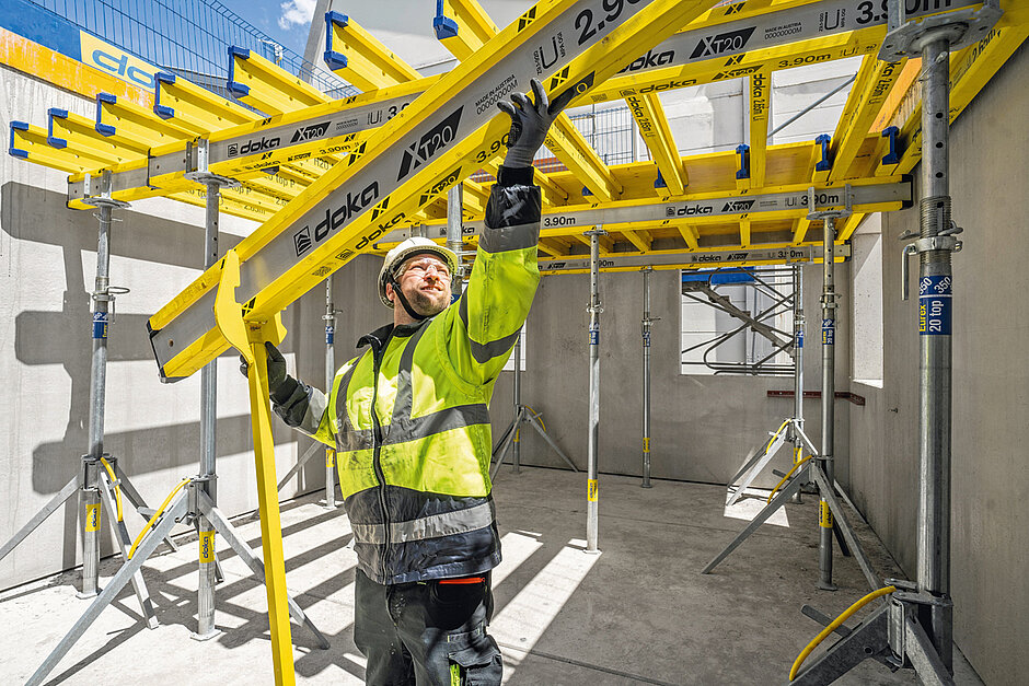 Ein neues Sicherheits-Upgrade für Träger-Deckenschalungen mit dem »Safeflex«-Schiebegitter und »Safeflex«-System soll außerdem neue Maßstäbe in Sachen Stabilität und Sicherheit sowohl bei Fertigteil- als auch bei Ortbetonanwendungen setzen. Um die Effizienz zu steigern, führt Doka neue Komponenten ein. Ein besonderes Highlight ist der neue »XT20«-Träger. Er bietet 50 Prozent mehr Tragfähigkeit und spart damit bis zu 15 Prozent an Material und Kosten. Trotz seiner neuen Eigenschaften bleibt er in den gewohnten H20-Abmessungen, ohne die Kompatibilität zu beeinträchtigen.