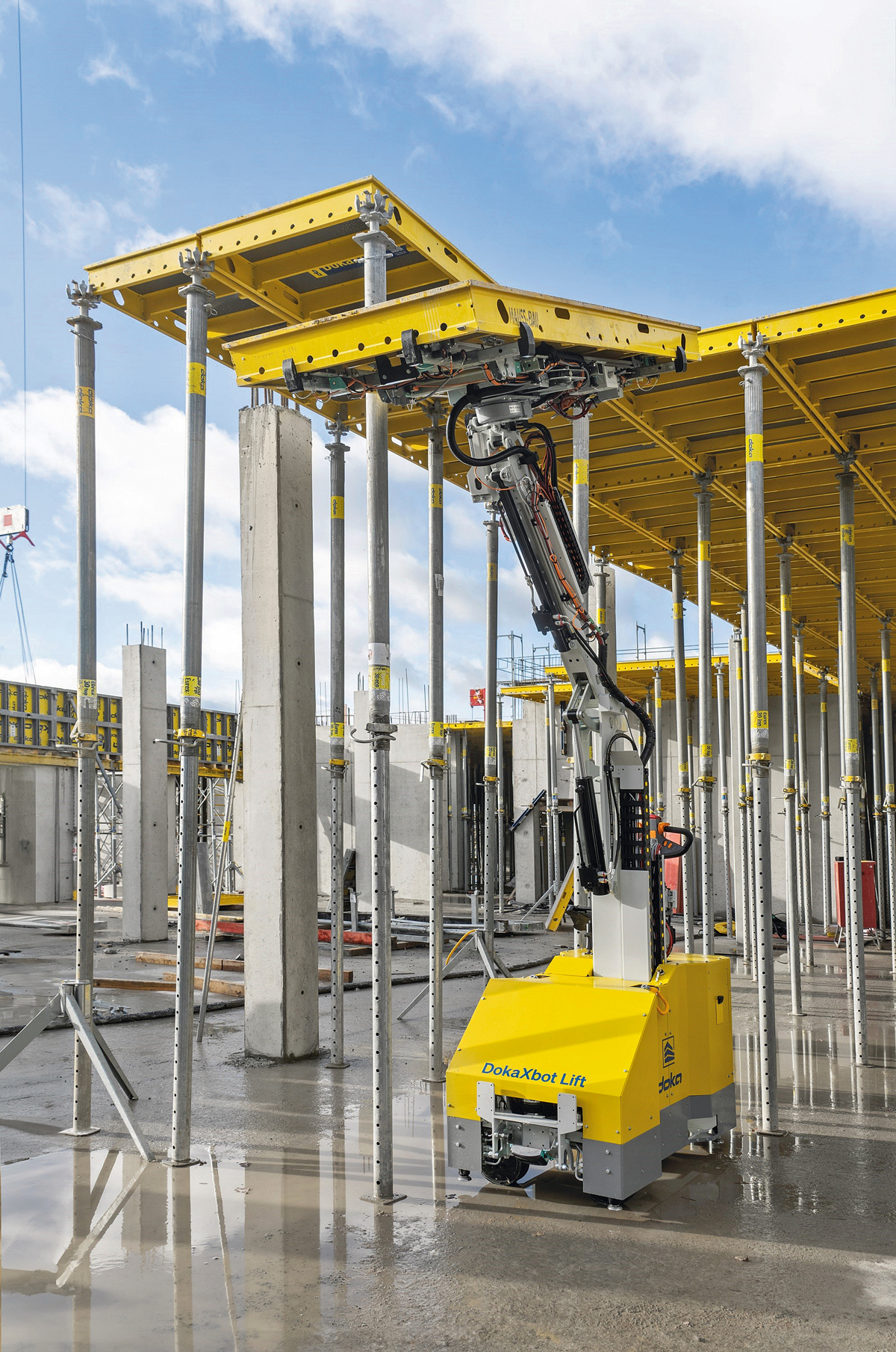 Im neuen Außenbereich »Smart Construction« feiert eine neue Methode zur Errichtung von Betonwänden ihr Debüt: Die zentrale Vormontageplattform Doka »LeanForm« ermöglicht es, komplette Schalungseinheiten an einem sicheren, kontrollierten Arbeitsplatz wie am Fließband zu montieren, bevor sie mit einem Kran an ihren Einsatzort gehoben werden. Vorteile sind u. a. kürzere Wege zwischen Lager und Arbeitsplatz, Minimierung des Transportbedarfs sowie reduzierte Such- und Wartezeiten auf der Baustelle. Einen kleinen Blick in die Zukunft wirft zudem ein Roboter, der verschiedene Komponenten an der Vormontageplattform bewegen und platzieren wird. Seine Premiere hatte der Prototyp zwar schon auf der letzten Messe, aber für die Bauma wurde der »DokaXbot«-Lift komplett überarbeitet. Mit intuitiver Bedienung vom Boden aus, automatischer Feinjustierung und Ausgleich von Bodenunebenheiten ermöglicht er das präzise Positionieren von Schalungselementen in bis zu 5,7 m Höhe und soll das Arbeiten über Kopf sicherer und effizienter machen.