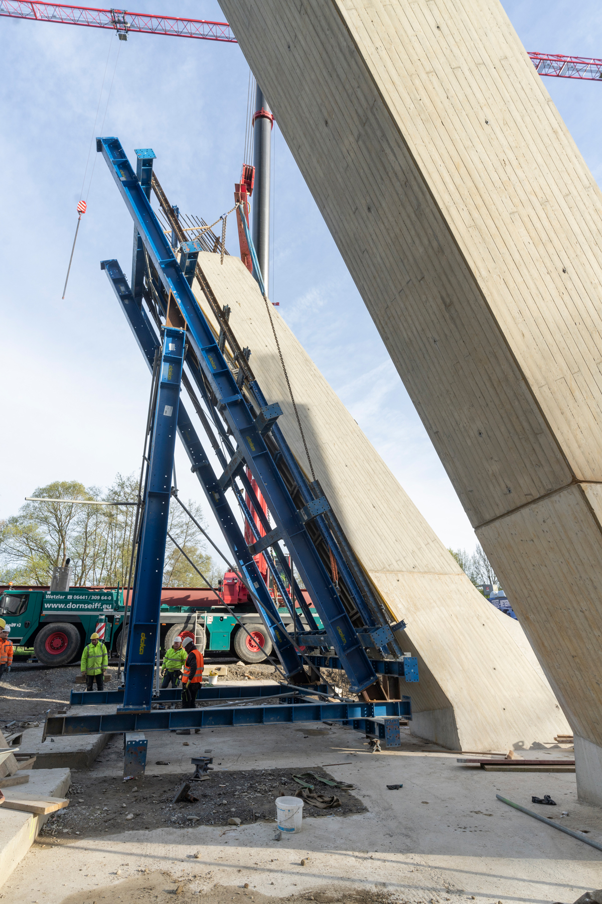 Jeder der vier Beton-Äste hat eine doppelte Neigung: Durch ihre V-Form sind die direkt gegenüberliegenden Pfeilerarme um 62° nach außen gekippt. Zudem neigen sich die beiden gegenüberstehenden V-Stützen um 79,2° nach außen. Mit knapp 12 m Höhe und einem Querschnitt von 1,9 m x 1,9 m pro Pfeilerarm lastet beim Betonieren ein beachtliches Gewicht auf der Schalung, so dass die Kräfte sicher abgeleitet werden müssen. Darüber hinaus sollte der flüssige Ortbeton mit Außenrüttlern bewegt werden. Die durch sie verursachte Vibration zerrt stärker an der Schalung als bei einem Innenrüttler. „Das war aber nicht die einzige Schwierigkeit. Im BIM-Modell sahen wir, dass die V-Pfeilerarme in der Draufsicht nicht linear zueinander verlaufen, sondern sie jeweils um 5,9° gedreht sind“, so Martin Schmid, technischer Projektleiter bei Doka. „Damit fiel für uns eine konventionelle Lösung aus Top 50-Gespärre mit vielen Spindelstreben raus, denn diese Drehung hieße, die Schalungskonstruktion beim Verziehen am Boden um insgesamt 11,8° drehen zu müssen. Das macht in der Praxis fast einen halben Meter aus, und die Schalungskonstruktion wiegt ja einige Tonnen. Würde man diese Schalungslösung zum Umsetzen wieder weitestgehend zerlegen, hätte das einen hohen Aufwand für die Baustelle bedeutet. Also haben wir uns eine andere Schalungslösung überlegt.“