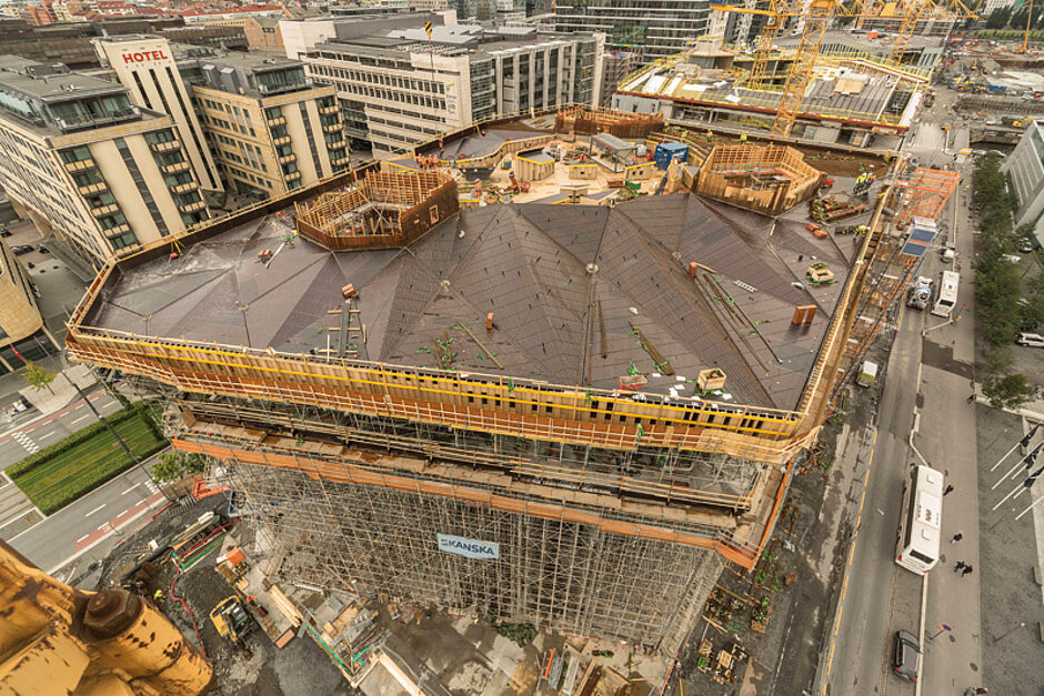 In der Nähe der Osloer Oper und des neuen Munch-Museums wird die 23 500 m² große Bibliothek errichtet. Das fünfstöckige Gebäude bietet künftig nicht nur einen ausgedehnten Ausblick auf Stadt und Fjord, sondern besticht auch durch eine offene, lichtdurchflutete Architektur. Das architektonische Konzept, das von Lund Hagem in Zusammenarbeit mit dem Atelier Oslo stammt, baut auf einem großen, zentralen, durchgängigen Bibliotheksraum auf, der sich auf den Etagen nach oben erstreckt. Durch die teilweise transparente Fassade und diagonale Lichtschächte soll das Gebäude ganztägig mit Tageslicht durchflutet werden. Ein besonderer Blickfang der Bibliothek ist die Faltendecke mit ihren verschiedenen Kanten und Winkeln, die das Tragen der Hauptauskragungen des Gebäudes und die Aussparungen für die Lichtschächte ermöglicht. Das Engineering und der Fertigservice von Doka lieferten dafür eine maßgefertigte Schalungslösung.