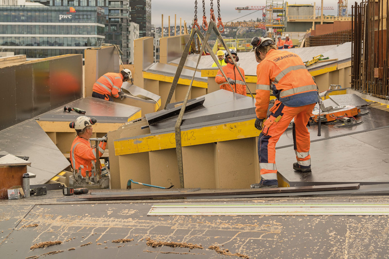 Für die Faltendecke der Bibliothek produzierte der Doka-Fertigservice in Amstetten 526 Schalungsboxen mit einer Fläche von 2 600 m². »Die unterschiedlichen Schalungsboxen wurden ohne Produktionsfehler auf die Baustelle geliefert. Hier muss man wirklich die sehr gute Arbeit der Mitarbeiter von Doka hervorheben, vor allem in Bezug auf das Design und die Produktion«, sagt Nils Skinnarland, Baustellenleiter bei Skanska. Die einzelnen Schalungselemente wurden in einem 3D-Modell gestaltet und anschließend mit CNC-Fräsmaschinen ausgeschnitten. Insgesamt wurden dafür 1 080 Zeichnungen angefertigt und knapp 1 850 Stunden investiert.