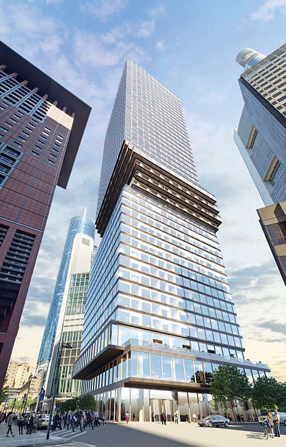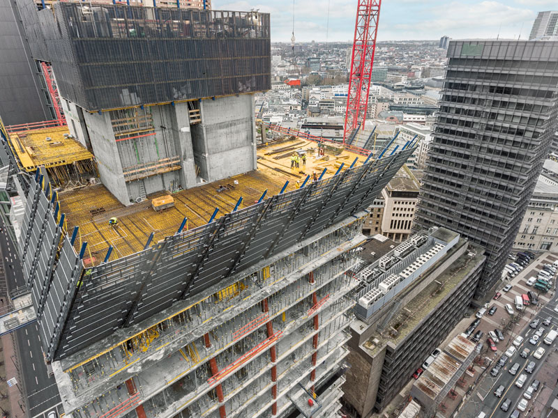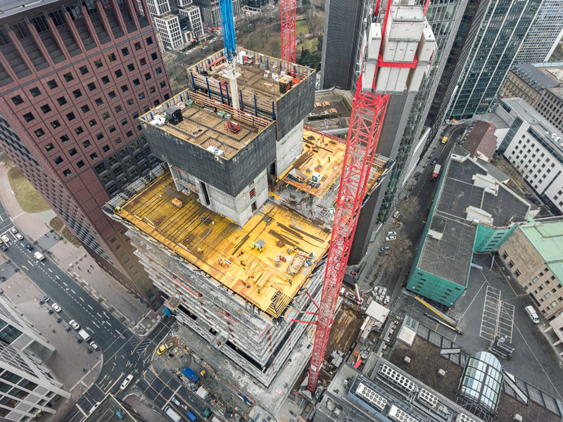 Frankfurt am Main ist bekannt für seine Skyline aus Wolkenkratzern. Mit dem Omniturm, der am Ende ca. 190 m messen wird, entsteht in der Großen Gallusstraße aktuell das sechsthöchste Gebäude der Stadt, schräg gegenüber von Deutschlands höchstem Gebäude, dem Commerzbank Tower (259 m). Mit seiner Fertigstellung, die für Anfang 2019 geplant ist, verfügt Frankfurt dann über Europas einzige Straßenkreuzung, bei der an jeder der vier Ecken ein Hochhaus (≥ 100 m Höhe) steht. Zudem wird der Omniturm deutschlandweit das erste Hochhaus mit Mischnutzung darstellen, das gleichzeitig Büro-, Wohn- und öffentliche Flächen enthält. Auch optisch wird er »herausragen«. Denn der Entwurf des Architekten Bjarke Ingels (BIG) sieht für die Stockwerke 15 bis 22 eine spiralförmige Verschiebung der Ebenen zueinander vor – eine ungewöhnliche Herausforderung für das bauausführende Unternehmen Adolf Lupp und deren Schalungstechniker von Doka.