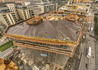 In der größten Verschiebung liegt der Residential-Bereich um insgesamt mehr als 5 m zur Grundlinie versetzt. Da die Deckenränder hier gleichzeitig als Balkone bzw. als Vordächer genutzt werden, beträgt die Stärke der Deckenränder lediglich 15 cm. Um die hohen Lasten sowohl bei der Betonage als auch des Schutzschilds tragen zu können, wurde hier mit extrem tragfähigen Unterstellungen gearbeitet. So finden sich unter den Ecken des Residential-Bereichs Gespärre und Stützen, die sonst nur im Brückenbau eingesetzt werden. Im März erreichte das Schutzschild seine stärkste Neigung. Danach wandern die Ebenen zurück zur Grundlinie, um wieder senkrecht nach oben zu wachsen.