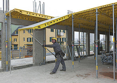 Die Sicherheitsanforderungen auf der Baustelle in der belebten Innenstadt sind enorm. Sowohl Passanten und Autofahrer, die jeden Tag zu tausenden die Baustelle passieren, als auch die Baustellenmannschaft müssen vor herabfallenden Gegenständen bzw. gegen Abstürze und selbst extreme Witterungsverhältnisse geschützt werden. Normalerweise würde man ein senkrechtes Schutzschild aufbauen, das mit der Baustelle mitklettert – was aber aufgrund des verschobenen Residential-Bereichs nicht möglich war. Also tüftelten die Ingenieure von Doka an einem Novum: einem Schutzschild, das nicht nur senkrecht hydraulisch klettern kann, sondern sich in den versetzten Ebenen – ohne Umbauten – entweder nach vorne oder nach hinten und gleichzeitig sogar zur Seite neigen lässt. Das Gebäude macht an den zueinander verschobenen Ebenen einen Sprung von je bis zu 1,35 m. Das Schutzschild wird damit je nach Ausrichtung in alle Richtungen um bis zu 21° geneigt. »Das Besondere an diesem Windschild: Man kann über Lamellen eine Parallelverschiebung in beide Seiten vornehmen und variabelst in der Höhe verstellen. Das ist für unser Projekt eine große Hilfe – eine sehr große Hilfe sogar«, sagt Michael Bellon, Oberpolier der Baufirma Lupp.