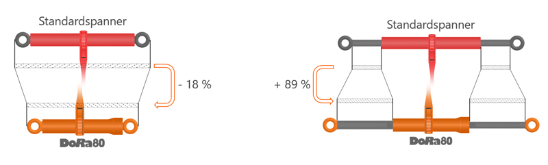 Der DoRa-Spanner verfügt ebenso über eine spezielle, gewindeschonende Ausdrehsicherung und ist reparabel. Der inzwischen patentierte DoRa80 kann als Spannelement für 10-8er-Zurrketten (Kettennenndicke 10 mm, Güteklasse 8, LC 6 300 daN) und 10-10er (Kettennenndicke 10 mm, Güteklasse 10, LC 8 000 daN) eingesetzt werden. Weitere Varianten bis LC 16 000 daN – dann auch kombinierbar mit der textilen Kette DoNova PowerLash – sollen folgen. t