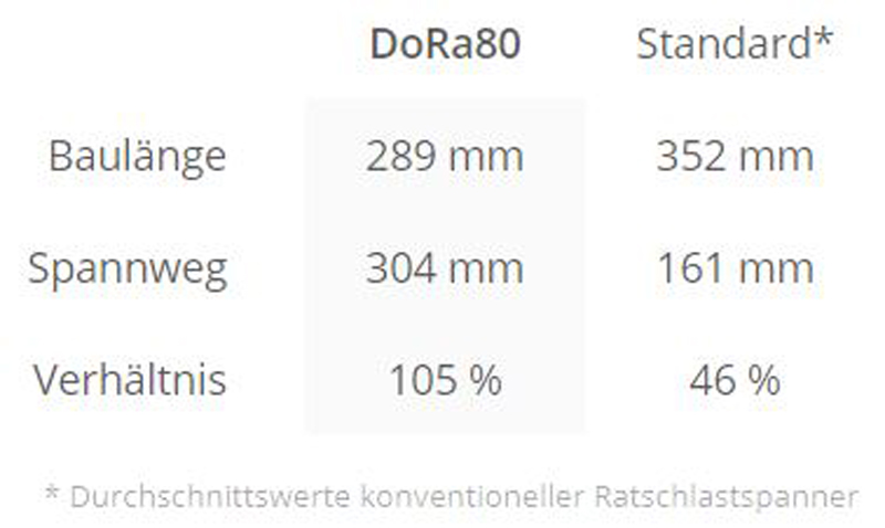 Der lange Spannweg erlaubt ein Einhaken in weiter voneinander entfernte Kettenglieder, sodass die Zurrketten nach dem Spannen stramm gespannt sind und nicht mehr durchhängen. Die großen Spannweg-»Reserven« des DoRa-Spanners sorgen wiederum dafür, dass dieser zum Nachspannen bei Ladungsversatz nicht abgenommen und neu gespannt werden muss. Der vorhandene Spannweg reicht nach Herstellerangaben aus, um ein einfaches Nachspannen an der ursprünglichen Position des Spanners zu ermöglichen. Und zudem ermöglicht die kompakte, kurze Bauform einen komfortablen Einsatz, wenn wenig Platz zum Zurren ist.
