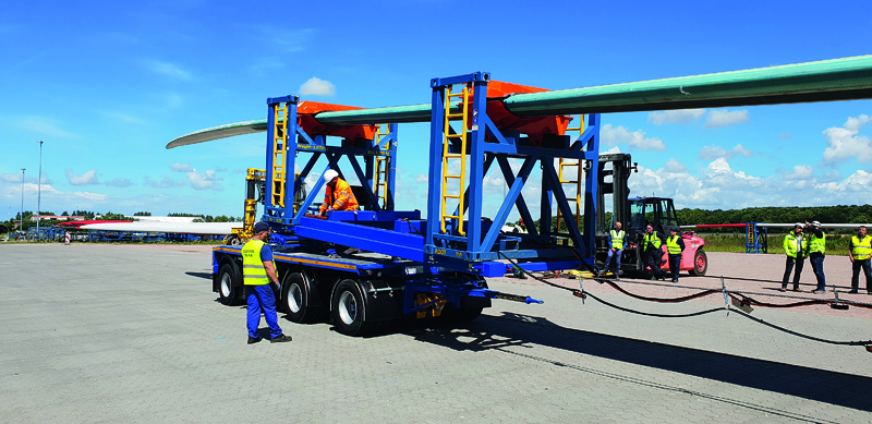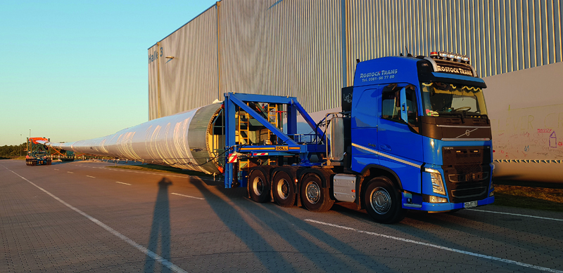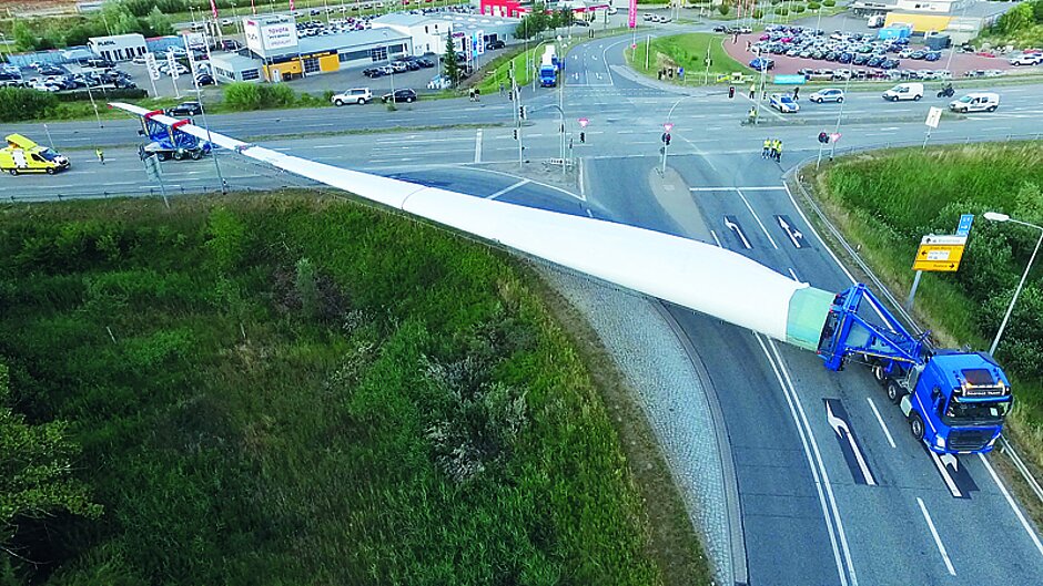 »Bei Windkraftanlagen geht der Trend zu immer längeren Blättern«, stellt Laars Hennek fest. Die Nordex Group berücksichtigt die damit wachsenden Transportanforderungen bereits bei der Entwicklung der Anlagen, erreiche doch die Transportmöglichkeiten konventioneller Semitrailer allmählich das Limit. »Das Transportequipment ist sowieso schon teuer. Mit jedem Meter Teleskopausschub werden die Semitrailer noch teurer – und schwerer. Am Ende braucht man dann vielleicht eine Fünfachs-Zugmaschine, wodurch dann wieder der Aufliegerhals länger werden muss und das realistische Nutzlastplus immer weiter schrumpft«, so Hennek. Mit den neuen, vierachsigen Vario-Nachläufern im Fuhrpark sieht er der näheren Zukunft gelassen entgegen: »Damit sind wir auch für Blätter bis 100 m Länge und 33 t Gewicht noch gut gewappnet.«