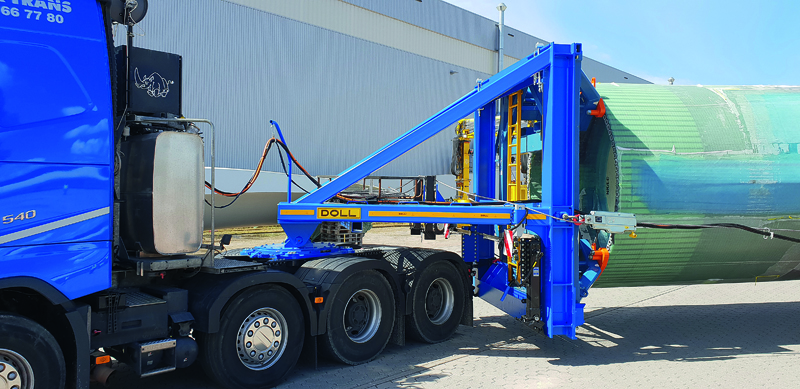 Das Herzstück der Transporteinheit ist das »bombenfeste Wechselsystem auf dem Lkw«, ergänzt Rolf Gerhardt, Leiter Produkt-Management bei Doll Fahrzeugbau. Die kombinierte Dreh-/Wipplagerung gewährleiste das gleichförmige Wippen des Rotorblattes und des Wipplagers über dem Drehpunkt auf der Zugmaschine. Dabei entstünden keine Torsionsmomente und auch hohe Schwerpunkte könnten sicher gefahren werden, was in Extremsituationen enorm hilfreich sei.