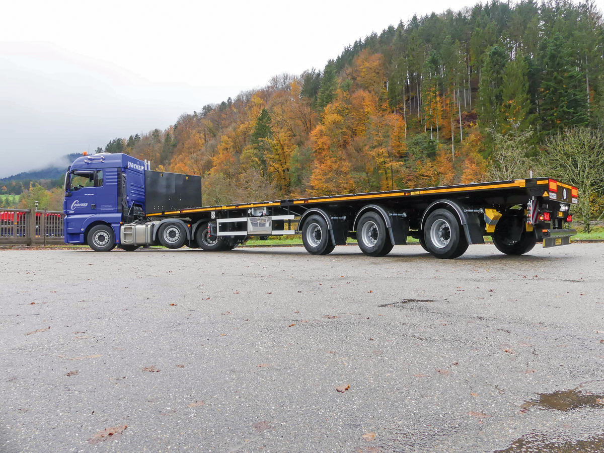 Überzeugt ist der Spediteur zudem vom Lenkverhalten. Die hydraulische Doll-Lenkung erlaubt einen Lenkeinschlag von bis zu 45 Grad. An engen Stellen kann der Fahrer zusätzlich per Funkfernbedienung manuell nachlenken. Aufgrund der automatischen Einspurung spurt das Fahrzeug danach mit nur einem Knopfdruck selbstständig wieder ein. Mit Blick in die Zukunft war es zudem wichtig, ein hochwertiges und langlebiges Fahrzeug zu kaufen. Der Doll Plattform-Auflieger ist dazu durch eine Spritzverzinkung effektiv gegen Korrosion geschützt.j
