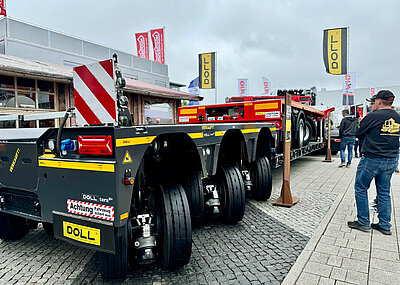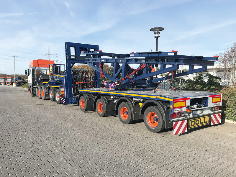 Mit Bolk Transport und Universal Transport haben sich kürzlich zwei weitere Spezialisten in Sachen Windkraftanlagen für Nachläuferkombinationen von DOLL entschieden. In beiden Fällen fiel die Wahl auf hydraulische Hubadapter auf einem Dolly, um auch für immer weiter steigende Rotorblattlängen und -gewichte über ausreichende Reserven zu verfügen. Bei rund 7 t bis 7,3 t Eigengewicht (je nach Ausstattung) und maximal 30 t Sattellast verbleiben am Dolly rund 23 t Nutzlast. Am anderen Ende sind mit den vierachsigen Vario-Nachläufern bei 40 t technischem Gesamtgewicht rund 32 t Nutzlast geboten. Selbst für Rotorblätter an der 100-m-Marke herrscht so mit den Nachläufer-Kombinationen Planungssicherheit.