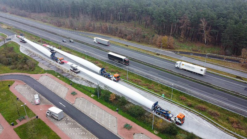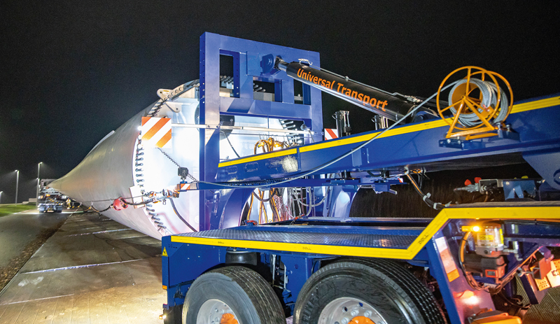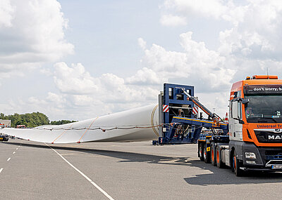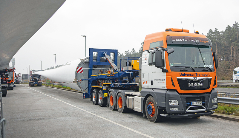 Die neuen Kombinationen hätten sich durchweg bewährt, bestätigt auch Holger Dechant, Geschäftsführer von Universal Transport. »Wir müssen nunmal auf die immer längeren Rotorblätter reagieren.« Er spricht dabei ein Thema an, das rund um die Windenergie den gesamten Transportsektor bewegt. »Die Parameter in der Windkraftbranche verschieben sich ständig, sowohl seitens der Politik als auch seitens der Anlagenhersteller. Wir haben somit einerseits sehr große Schwankungen beim Transportaufkommen, andererseits ständig neue Herausforderungen bei den Abmessungen. Allen voran bei den Rotorblättern, aber natürlich auch bei den Türmen und Maschinenhäusern. Mit dem klassischen Telesattel kommt man da nicht mehr weit. Das Equipment wird immer spezieller und, da verrate ich auch kein Geheimnis, immer kostenintensiver.«