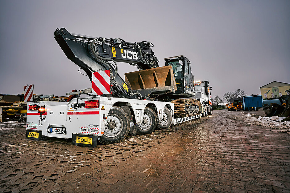 Bode Bautechnik verkauft und vermietet seit 35 Jahren Baumaschinen aller Größen – von der Rüttelplatte bis zum 37 t schweren Kettenbagger. Selbst die größten Baumaschinen liefert das mittelständische Unternehmen auf Wunsch direkt zum Kunden. Zum Einsatz kommt dabei ein Doll-Tiefbett »X« mit der Pendelachse »Doll tera«. Für die Wahl des Aufliegers war neben der Nutzlast von bis zu 45 t ein weiterer Aspekt ausschlaggebend: »Beim Transport der großen JCB-Bagger ist vor allem die Höhe des Baggerarms der limitierende Faktor«, erläutert Michael Schneider, Transportleiter bei Bode Bautechnik. »Durch die breite Baggermulde des neuen Tiefladers können wir den Arm tiefer ablegen und bleiben so unter 4 m Höhe.«