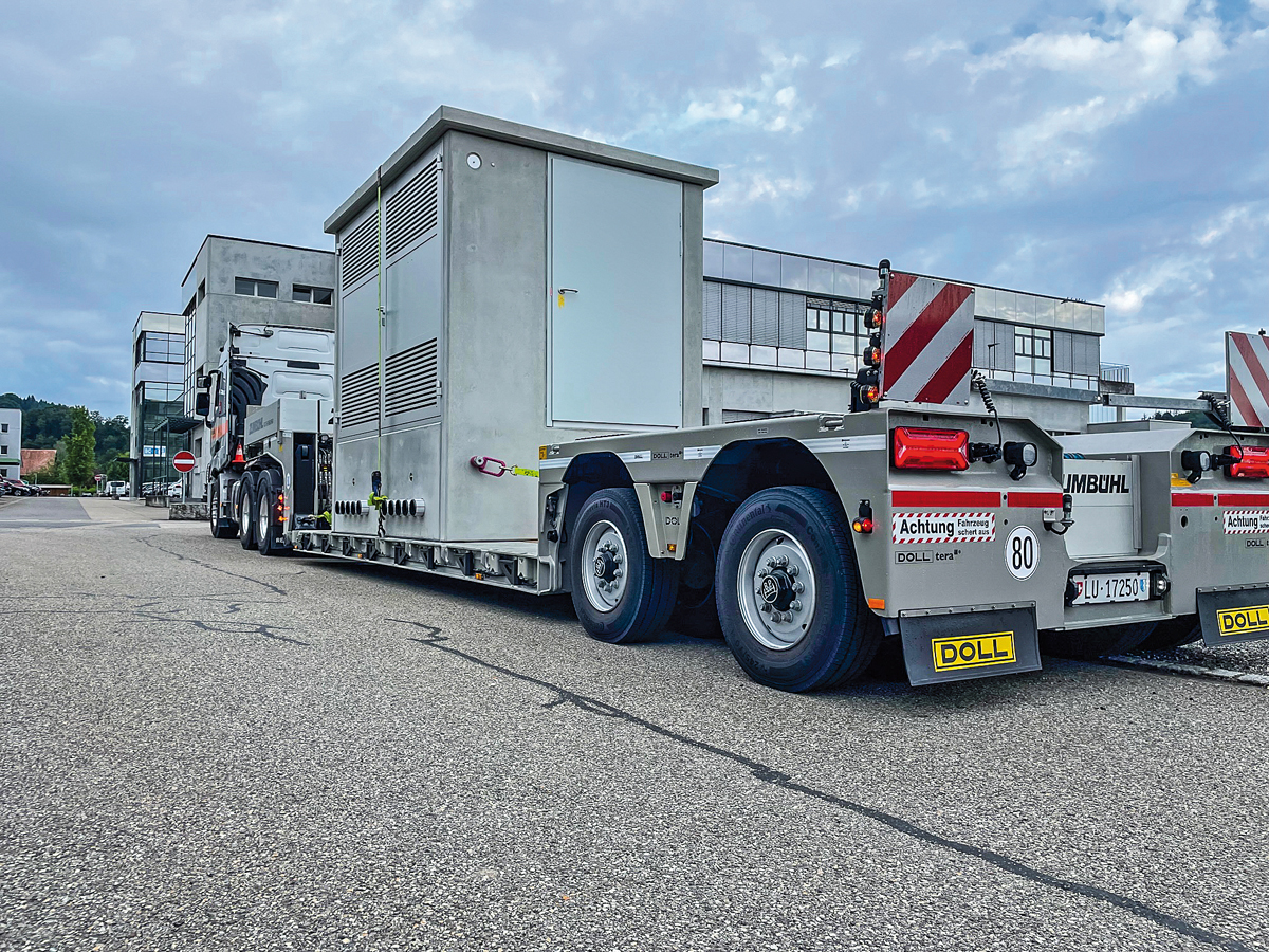 Ein weiterer Vorteil laut Doll: Größere Höhenunterschiede bei der Fahrt können durch den Hub leichter überwunden werden. Besonders wenn der Auflieger bei Leerfahrten teleskopiert ist, stellen steile Baustelleneinfahrten keine Hindernisse mehr dar. Auch für den Transport von schweren Betonelementen, deren Schwerpunkt außerhalb der Fahrzeugmitte liegt, setzt Zumbühl auf das tera-Tiefbett. »Die Pendelachse erlaubt es uns, rechts und links die Neigung einfach anzupassen«, so Imhof. Durch einen maximalen Lenkeinschlag von 60° bleibt das Fahrzeug dabei auch in engen Kurven gut manövrierbar. Die Pendelachse Doll tera bietet laut Hersteller auch einen »entscheidenden Vorteil für grenzüberschreitende Transporte«: Sie sei im gesamten europäischen Raum mit einem Ladegewicht von 12 t pro Achse zugelassen. Speditionen, die mit Einzelradaufhängungen unterwegs sind, so Doll, müssen möglicherweise für dieses Gewicht Sondergenehmigungen beantragen, wenn sie in ein anderes Land reisen. Das ist kosten- und zeitintensiv. Die Alternative ist eine Beschränkung auf eine Achslast von 10 t, was die Lademenge reduziert. »Mit der Pendelachse Doll tera sparen europaweit tätige Transportunternehmen Zeit und Aufwand und können schwere Ware auch grenzüberschreitend effizient transportieren«, betont Mathias Neumayer, Produktmanager Schwerlasttransport bei Doll.d