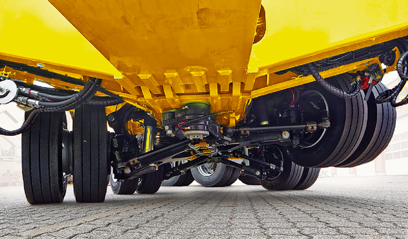 Das Herzstück der Semi- und Tiefbett-Sattelauflieger bilden die panther-Fahrwerke mit geteilten, hydraulisch gefederten und gelenkten 12-t-Achsen mit Einzelradaufhängung. Mit Ober- und Unterlenker entspricht der Aufbau einer Doppelquerlenkerachse, wobei die Räder in Zwillingsanordnung auf einer Radnabe montiert sind.