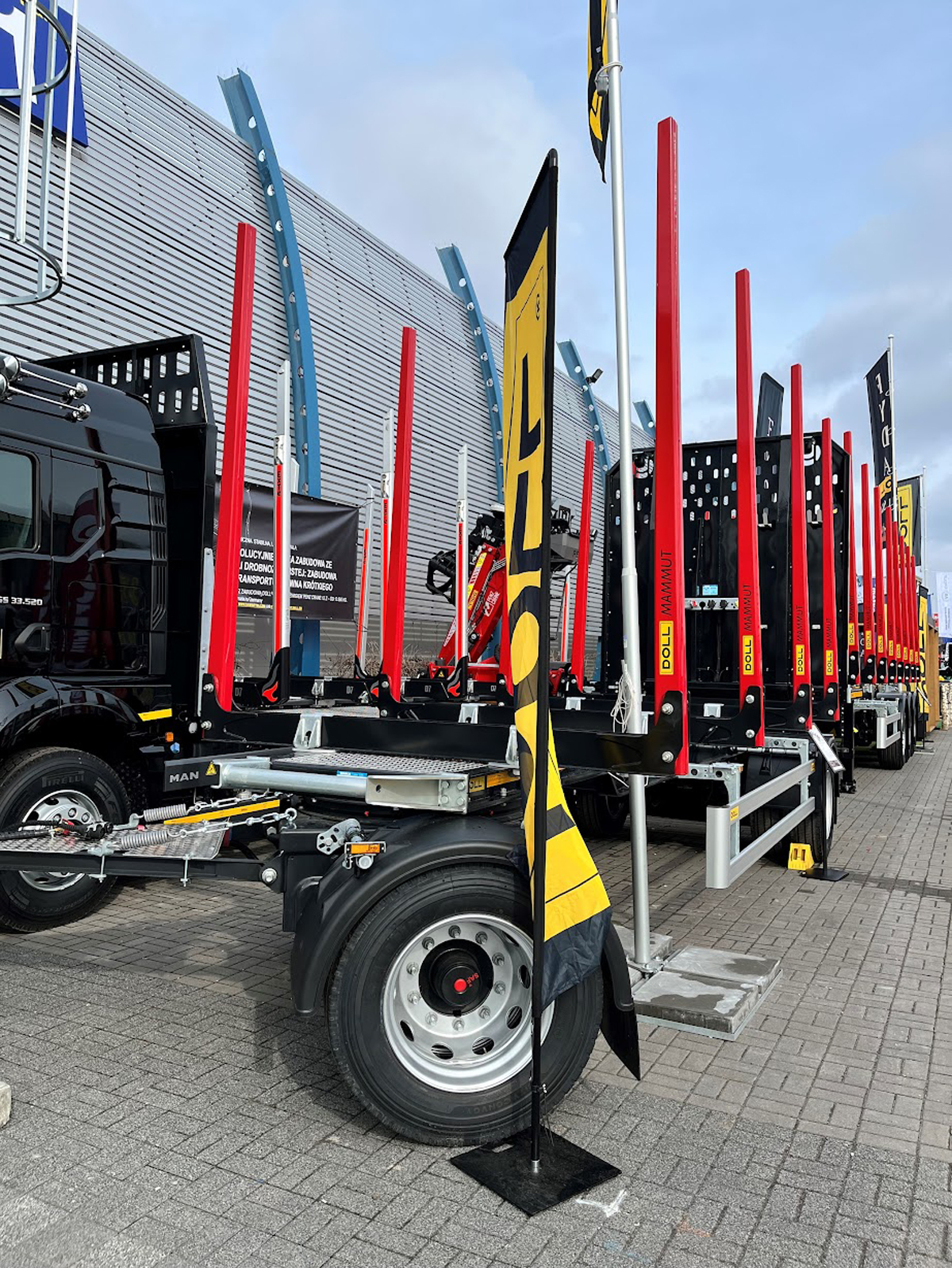 Für Transporteure, die eine größere Ladehöhe und mehr Nutzlast benötigen, eignet sich der dreiachsige Kurzholzanhänger A3K-LZ. Wie der zweiachsige Kurzholzanhänger hat auch der A3K ein niedriges Eigengewicht. Allerdings ist der Rahmen gekröpft und bietet bis zu 120 mm mehr Platz für die Ladung. Ebenfalls in Kielce ausgestellt: Der passende Kurzholzaufbau von DOLL für den Transport von bis zu 6 Meter langem Holz. Dieser verfügt über viele geschraubte Anbauteile und ist somit servicefreundlich. Genauso wie der Logo 12, ist der geschraubte Hilfsrahmen aus Feinkornstahl gefertigt. Das gewährleistet eine lange Lebensdauer und ein geringes Eigengewicht.