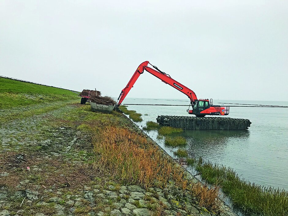 Das Haupteinsatzgebiet für den Bagger ist der rund 11,3 km lange Hindenburg-Bahndamm, der die Insel Sylt mit dem Festland verbindet. Rund 8,1 km des Damms verlaufen durch das Wattenmeer. Damit der in der Standardausführung rund 22 t schwere Kettenbagger nicht im Watt einsinkt, ist ein besonders geringer Bodendruck notwendig. Zu diesem Zweck stellte Jens Mewes, Verkaufsmitarbeiter bei Atlas Hamburg, der den Kunden Jacobs bereits seit vier Jahren betreut, den Kontakt zur Firma Olko her. Dort wurde der Oberwagen des Doosan DX225LC-5 auf einen amphibischen Unterwagen montiert. Im Gegensatz zu einem Standard-Ponton bleibt so die volle Manövrierfähigkeit erhalten.