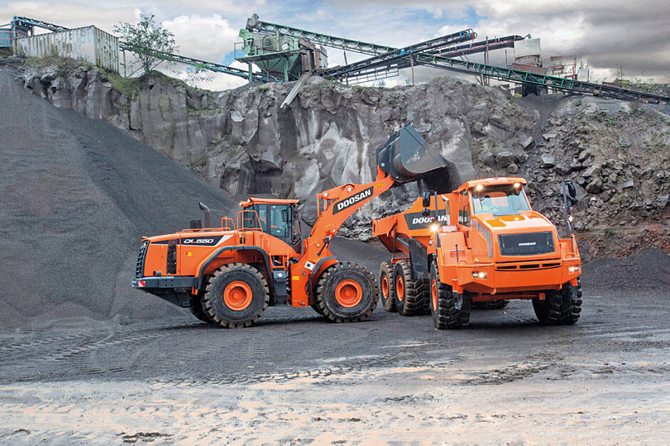 Das Highlight wird auch in diesem Jahr auf dem Demogelände zu sehen sein. Hier will Doosan ein perfektes Zusammenspiel des Kettenbaggers DX 530LC-5, des Radladers DL 550-5 und des knickgelenkten Muldenkippers DA 40 demonstrieren. Der DX 530LC-5 wird vom Scania-Dieselmotor DC13 angetrieben, der bei 1 800 min⁻¹ eine Leistung von 283 kW (385 PS) liefert. Es besitzt ein Betriebsgewicht von 51,6 t. Bei dem Radlader DL 550-5 handelt es sich um das Spitzenmodell der Baureihe großer Radlader von Doosan. Mit einem Schaufelvolumen von 5,4 m³ bietet er sich als eine ideale Maschine für den Materialumschlag an. Der knickgelenkte Doosan-Muldenkipper DA 40 verfügt über eine Nutzlast von 40 t und will einen in seiner Klasse nach Anbieterangaben wegweisenden Kraftstoffverbrauch mit einer Höchstgeschwindigkeit von 58 km/h kombiniert. Der DA 40 weist zudem mit 24,4 m³ ein großes Fassungsvermögen der Mulde auf. §