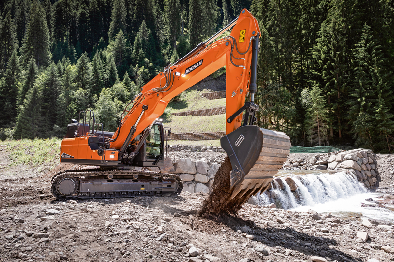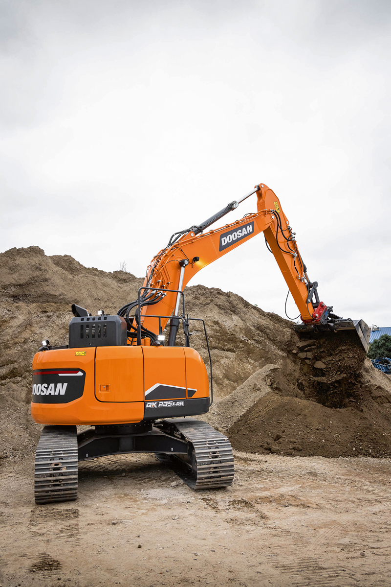 Der neue DX235LCR-7 mit verringertem Heckschwenkradius soll hingegen neben einer überragenden Grableistung auch mit hoher Flexibilität, entsprechendem Komfort und geringen Betriebskosten, kompaktem Design sowie einem minimalen Heckschwenkradius von 1 724 mm zu überzeugen wissen. Das Modell DX235LCR-7 soll der steigenden Nachfrage nach Maschinen mit reduziertem Schwenkradius für Arbeiten in Gebäudenähe und auf begrenztem Raum gerecht werden. Trotz kompakter Maße will der DX235LCR-7 mit laut Hersteller überragenden Hubleistungen aufwarten. Verfügbar ist er u. a. mit einem neuen optionalen schweren Gegengewicht. Zudem hat Doosan das Konzept der standardmäßigen und optionalen Gegengewichte aktualisiert, um die Wartungszugänglichkeit zu verbessern und so möglichst komfortable Wartungsarbeiten zu gewährleisten. Wie die übrigen Modelle der neuen mittelschweren Reihe haben auch die neuen 20-t-Modelle ein modernes intelligentes Hydrauliksystem erhalten, das im Vergleich zu früher eine um rund 30 % höhere Arbeitsleistung der Anbaugeräte verspricht.