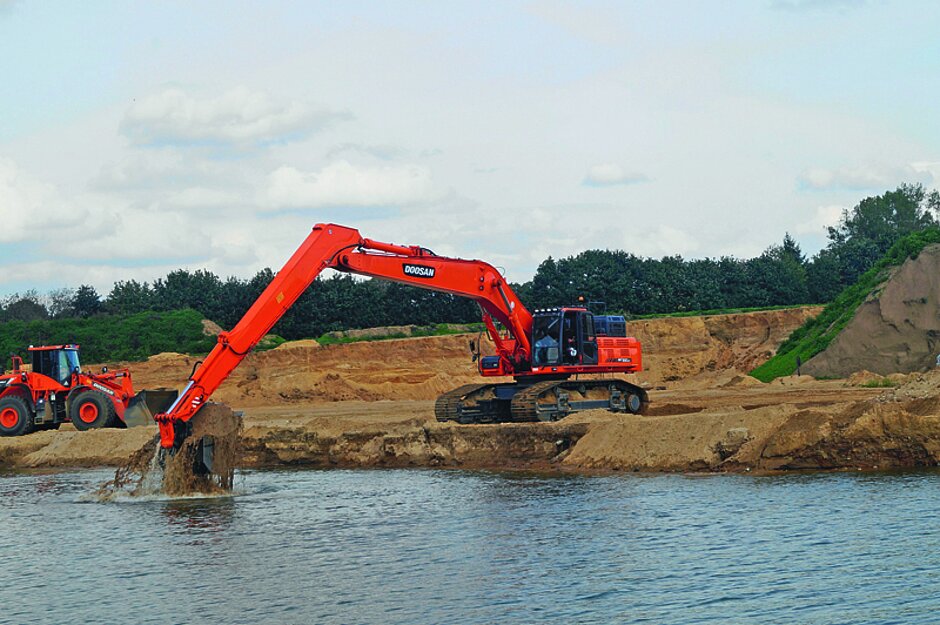Die Arbeiten unter Wasser hatte bisher ein rund 40 Jahre alter Scraper durchgeführt, der kurzfristig ersetzt werden musste. Die Anforderungen an den neuen Bagger waren hoch: Er sollte in einer Wassertiefe bis zu 9 m arbeiten können und innerhalb von zwei Monaten ausgeliefert werden. Die Lösung konnte Atlas Hamburg den Kieswerken Silzen Peissen mit dem DX530LC-5 von Doosan präsentieren, mit einem, nach Kundenwunsch gefertigten, 18 m langen Ausleger.