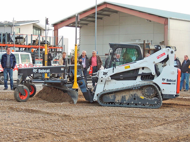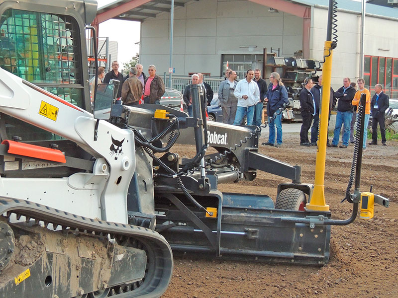 Im anschließenden praktischen Teil wurde dann der Schritt von der Theorie in die Praxis vollzogen. So präsentierte das Unternehmen verschiedene Maschinen und Anbaugeräte, die im Anschluss auch Probe gefahren werden konnten. Mit einem T770 Kompakt-Raupenlader von Bobcat wurde eine Fläche mithilfe des Kraftrechens vorbereitet und anschließend mit dem 6-Wege-Planierschild und dem Bobcat-HD-Anbaugrader mit Lasersteuerung planiert.Nach der folgenden Weiterbearbeitung mit Stehr-Verdichtungsplatten war die Fläche dann für verschiedene weitere Bearbeitungsschritte vorbereitet.