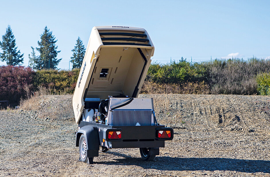 Für einen möglichst einfachen Wartungs- und Servicezugang lässt sich die Generatorenhaube zur Deichsel hin öffnen, die »Wartungsposition« lässt sich um mehr als 90° öffnen, was einen einfachen Zugang zu allen Komponenten des Kompressors ermöglicht. t