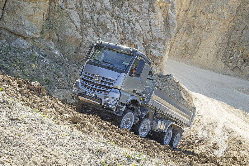 Steil nach oben geht es auch bei einer 30 %-Steigung. Dazu wird im hinteren Teil des Steinbruchs ein frisch planiertes Steilstück mit Erdaushub als Untergrund gewählt. Hier spannt der Arocs mit der 8x8-Antriebsformel die Muskeln an. Von drei zur Verfügung stehenden Sperren-Varianten wird allerdings nur die Längssperre eingesetzt. Dank Achslastausgleich ist die Gewichtsverteilung zwischen den beiden Vorderachsen bestmöglich ausgeglichen, die Traktion nahe bei 100 %. Sogar im dritten Gang mit 1 700 U/min lässt sich das Steilstück bezwungen.