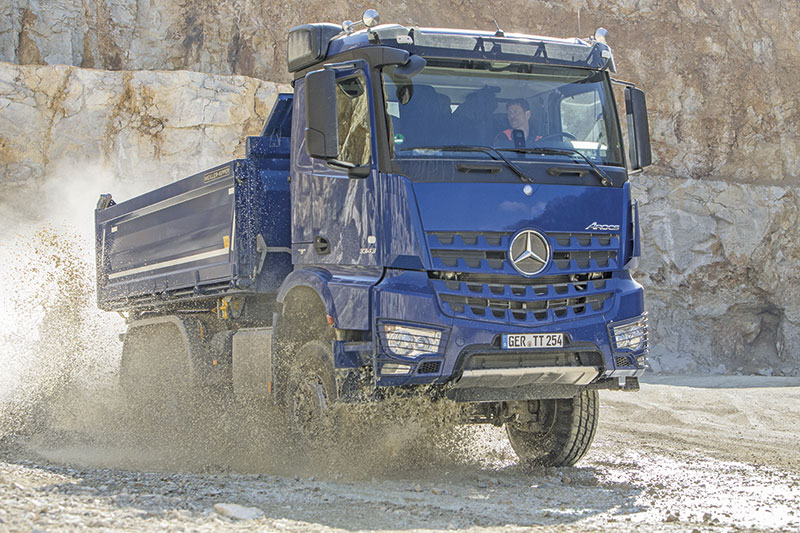 Der Arocs 4151 wird nicht nur permanent an allen vier Achsen mit Antriebskraft versorgt; er zählt auch noch zur Familie der Grounder, ist doch sein Rahmen nochmals verstärkt – von 8 mm auf 9 mm. Zusammen mit der ebenfalls verstärkten Federung ist er für Einsätze unter härtesten Bedingungen ausgelegt. Selbst voll beladen – im betriebsinternen Einsatz ist ein Gesamtgewicht von 41 t erlaubt – zeigte er in einem Test vor Ort keine Spur von Anstrengung.
