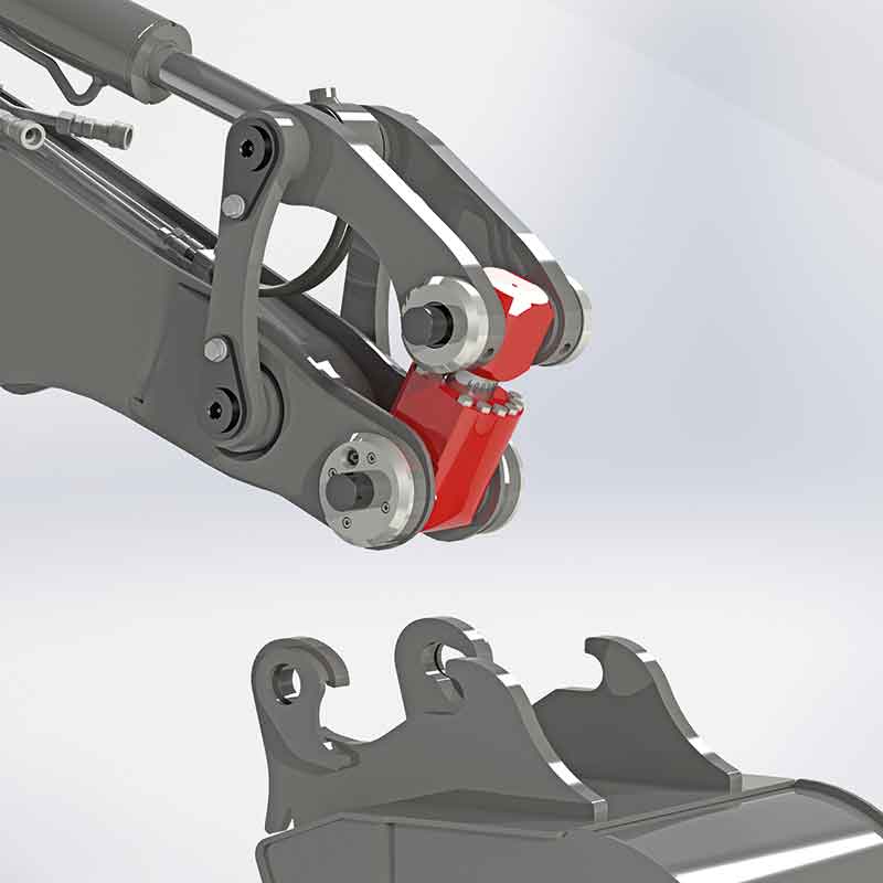 Der Hydraulikzylinder, der die beiden Bolzen verbindet, bewirkt (bei ausgefahrenem Zylinder) das Schließen sowie (bei eingefahrenem Zylinder) das Öffnen des Schnellwechslers.
