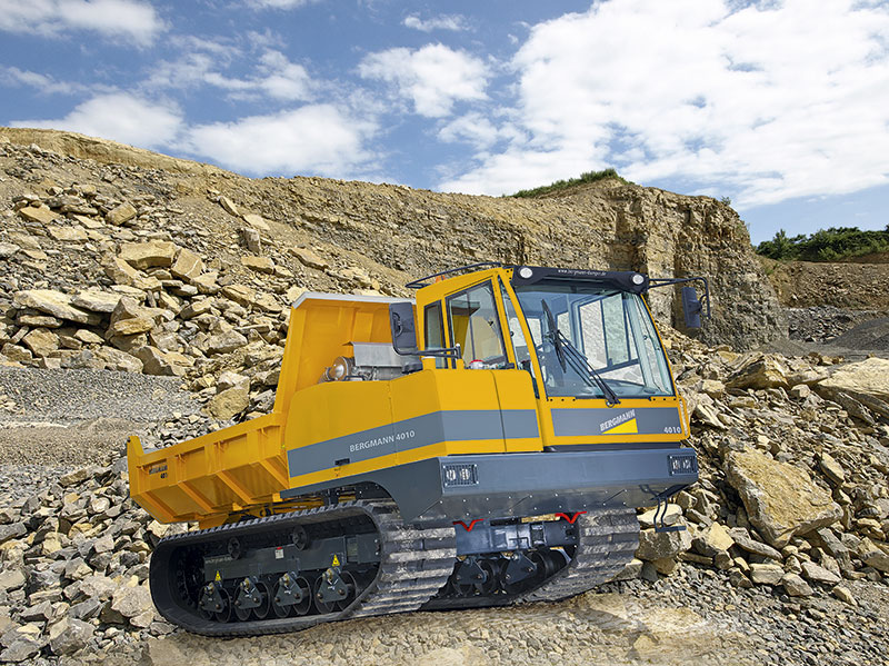 Mit mehr als 50 Jahren Erfahrung in der Entwicklung von Rad-Dumpern, Spezialfahrzeugen und Untertagedumpern startet Bergmann nun den Eintritt in den Kettendumper-Markt – und wird damit zu einem Fullliner unter den Dumper-Anbietern. »Durch die Erweiterung unserer Dumperserie 4000 können wir unseren Kunden nun auch für jene Fälle wirtschaftliche Transportgeräte anbieten, in denen ein niedriger Bodendruck gefordert oder gar vorgeschrieben wird«, so Verkaufsleiter Matthias Pistorius. Der neue Kettendumper 4010 erreicht mit seiner 6,3-m³-Mulde bei einer Nutzlast von 10 000 kg einen Bodendruck von nur 0,45 kg/cm². Damit erfüllt er die Anforderungen für Einsätze in nassen, sumpfigen Gebieten, im Pipelinebau, Deich- und Wasserbau oder in der Gewinnungsindustrie und im Moor. Zu einem Multitalent mit vielseitigen Einsatzmöglichkeiten wird der 4010 auch durch die von Bergmann selbst entwickelte Rahmenkonzeption. Sie ermöglicht, dass verschiedene Mulden wie Heckkippmulde, Rundkippmulde, Ladepritsche oder eine Absetzmulde auf das Fahrzeug aufgebaut werden können. Auch der Aufbau eines Schnellwechselsystems für sich häufig ändernde Anforderungen ist möglich. Mit der Kranausführung vor oder hinter der Kabine eignet sich der 4010 gut als Schweißraupe, wie sie für den Pipelinebau benötigt wird.Der Rahmen des 4010 ist in Modulbauweise aufgebaut und kann bei Bedarf entsprechenden Anforderungen angepasst werden. Die Fahrschiffe sind so ausgelegt, dass die groß dimensionierten Fahrantriebe, bestehend aus einem Planetengetriebe mit hydraulischer Parkbremse und einem zweistufigen Hydromotor, hinten angeordnet sind. Auf diese Weise wird die Kraft optimal auf die Kette übertragen. Gleichzeitig wird so eine bessere Gewichtsverteilung erreicht, die ihre Vorteile vor allem beim Einsatz als Schweißraupe (Kran vorne) und bei Talfahrten unter Beweis stellt. Angetrieben wird der Kettendumper von einem 6-Zylinder-Cummins-Motor mit 180 kW/244 PS (Tier 4 Interim/3B). Als einziger Kettendumper in dieser Leistungsklasse erfüllt der 4010 nach Anbieterangaben damit die europäischen Abgasnormen. Die Fahr- und Arbeitshydraulik ermöglicht ein stufenloses Fahren bis zu einer Geschwindigkeit von 14 km/h und verfügt über Reserven, wenn der Dumper beladen extreme Steigungen überwinden muss. Die Arbeitshydraulik ist serienmäßig mit einer 33 cm³ Zahnradpumpe für Nebenverbraucher ausgerüstet und kann optional auf eine 115 cm³ Axialkolbenpumpe erweitert werden.