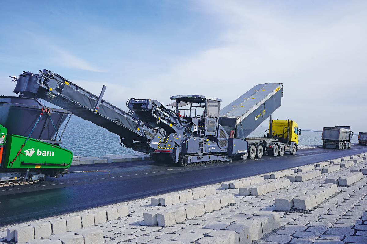 Der MF2500 Imix wird von Dynapac als Beschicker mit dem kleinsten ökologischen Fußabdruck auf dem Markt beschrieben. Ein Kraftstoffverbrauch von weniger als 10 l/h soll helfen, Nachhaltigkeitsziele zu erreichen. Das schlanke Konzept mit einer geringen Anzahl von Komponenten spare zudem Kosten für den Austausch und den allgemeinen Verschleiß. Und mit dem Förderbandkonzept von Dynapac sollen sich sämtliche Austauschvorgänge vorausschauend planen und durchführen lassen.