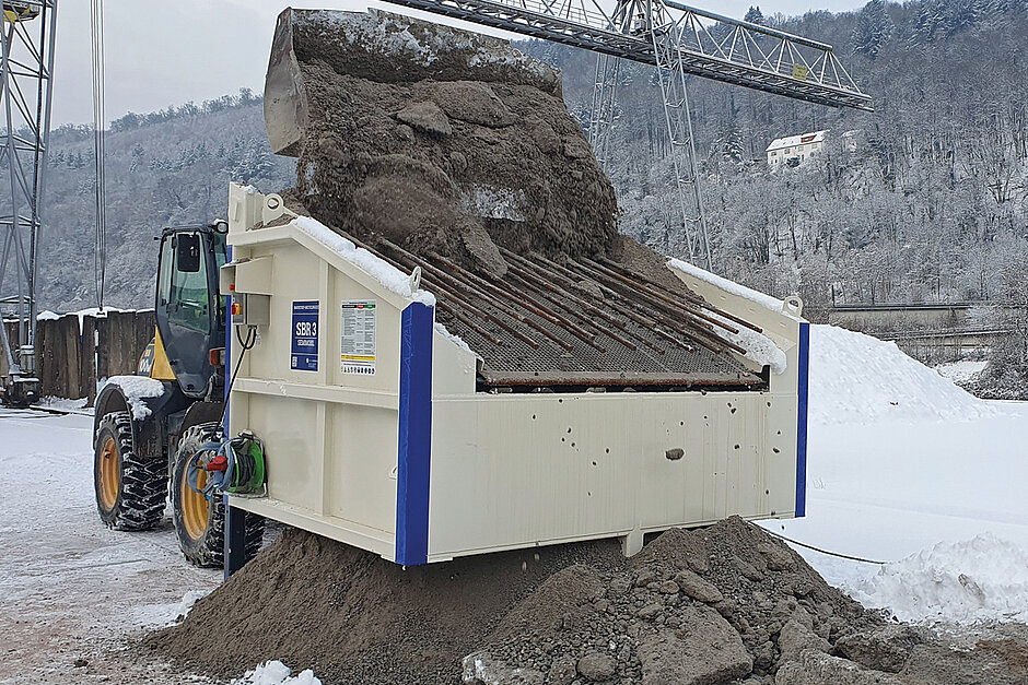 Das Baustoff-Recyclingsieb SBR 3 des Herstellers EAG Einfach Aufbereiten GmbH aus Dresden wurde konzipiert für den Einsatz im Straßen-und Tiefbau, um Straßenaufbruch, Aushub, Boden und Mineralgemische aufzubereiten. Containerdienste nutzen die robuste Siebanlage zudem zur Aufbereitung von Bauschutt und Garten- und Landschaftsbauer für Mutterboden. Aufgrund ihrer Leistungsstärke und Einstellmöglichkeiten wird das SBR 3 nach Angaben von EAG Trommelsiebanlagen der 3,5-t-Klasse vorgezogen. Die Kombination aus Robustheit und Leistungsstärke findet nun in einem weiteren Segment Einsatz: Denn aufgrund weiter steigender Transport- und Entsorgungskosten wird auch das Recycling von Restbetonmengen in Transportbetonwerken wirtschaftlich attraktiv.