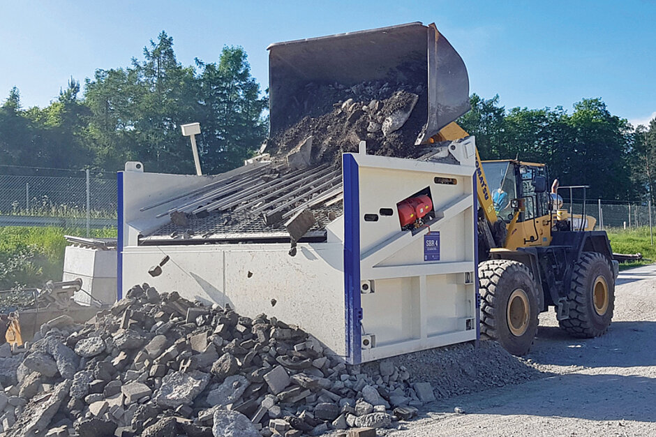 Mit einem Komatsu-Radlader des Typs WA 480 und 5,5 m³ Schaufelvolumen steht ein großer Radlader zum Materialhandling bereit. Dies stellt die obere Grenze im Zusammenspiel mit der SBR 4 dar und hat sich bei Robert König als praktikabel erwiesen. Über die Maschinenfüße werden Höhe und Neigung der Siebanlage per Bolzen-Stecksystem eingestellt.