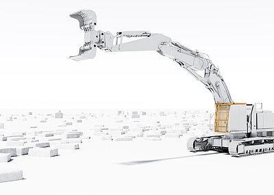 Die Standsicherheit war die zweite große Anforderung an dieses Projekt. Durch die Aufballastierung des originalen Kontergewichts kann ein sicherer Stand gewährleistet werden. Voraussetzung war aber auch, das maximale Transportgewicht der Maschine von 32 t nicht zu überschreiten, um die Logistik möglichst einfach zu halten und auf Sondergenehmigungen verzichten zu können. Daher wurde der Abbruchbagger mit einer Hubeinrichtung zum hydraulischen Absetzen des Kontergewichts ausgestattet, damit es separat auf einem LKW transportiert werden kann.