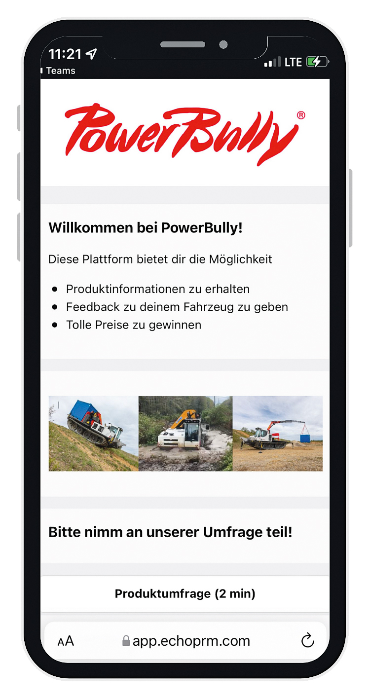 Partner der ersten Stunde ist die Firma Kässbohrer Geländefahrzeuge aus Laupheim, die Echo PRM für alle Marken des Unternehmens nutzt. »Unsere PowerBully-Fahrzeuge sind oft weit weg vom Schuss – beispielsweise in sehr unzugänglichem Gelände in Nordamerika. Wir erhoffen uns durch die Echo-PRM-Plattform schnelles und unkompliziertes Feedback für Service und Marketing – von Personen, an die wir sonst nicht rankommen«, so Simon Holland aus dem PowerBully-Team bei Kässbohrer. Dort schätzt man zudem die Möglichkeit, relevante Informationen rund um das Produkt vor Ort typenbezogen zur Verfügung zu haben.