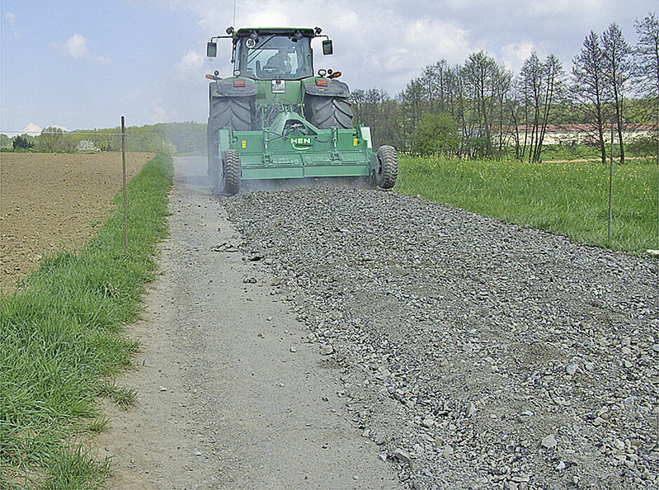 Das Lohnunternehmen Trautwein betreute die Straßensanierung von Grund auf. Mit einer HEN-Anbaufräse RBM-S 230 wurde der defekte Asphaltbelag recycelt, zusammen mit dem nicht kornabgestuften Unterbau durchgefräst und auf eine Kornabstufung von 0/45 als homogene Masse zur Verfestigung mit einem auf Zementbasis ausgestreutem Bindemittel optimal vorbereitet.