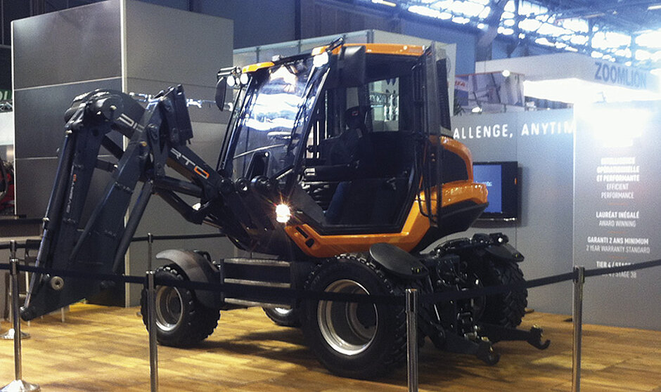 Der auf der Intermat gezeigte Prototyp des im niederländischen Wemeldinge beheimateten Unternehmens verfügt dank eines Tier 4 interim/Stufe IIIB-konformen 4,5-l-Motors von John Deere über eine Leistung von 74 kW (100 PS) – und dementsprechend über ein sehr hohes Drehmoment. »Dadurch sind die Brech-, Hub- und Reißkräfte des Q-Synchro 100 ähnlich gut wie bei einem klassischen Mobilbagger«, so Huissoon. Auch hinsichtlich der Traktion seien die Werte außergewöhnlich.