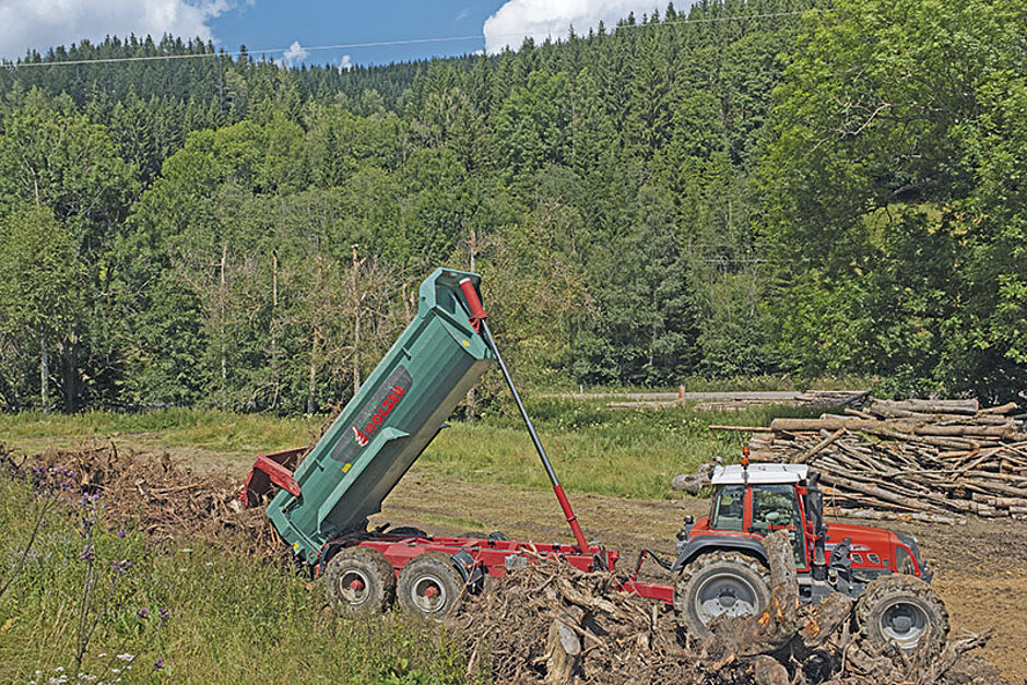 »Der Auftrag erstreckt sich auf insgesamt über ein Jahr«, weiß Profiteam-Geschäftsführer Thomas Holzer zu berichten. Dabei muss das gerodete Holz vom Trassenbau ins Tal gebracht werden, darunter sind auch tonnenschwere Wurzelstöcke. »Für den Transport dieser Kaliber brauchten wir natürlich einen entsprechend robusten Muldenkipper«, erzählt Holzer weiter. »Wir haben alle auf dem Markt befindlichen Produkte verglichen, und der Gravis 2000 passt hierfür einfach perfekt«, lobt er die robuste Ausführung des Gerätes und die gute Zusammenarbeit mit dem Farmtech-Händler Steinkellner Landmaschinentechnik aus Obdach. »Man braucht ja nur einen Blick auf die Maschine zu werfen und sieht, wie stabil sie ist. Wir sind sehr zufrieden mit unserer Entscheidung für dieses Produkt«, ergänzt Holzer. »Die Maschine hat ein perfektes Preis-Leistungs-Verhältnis.« Ein hohes Lob, dem die Maschine im alltäglichen, harten Einsatz nun gerecht werden muss.