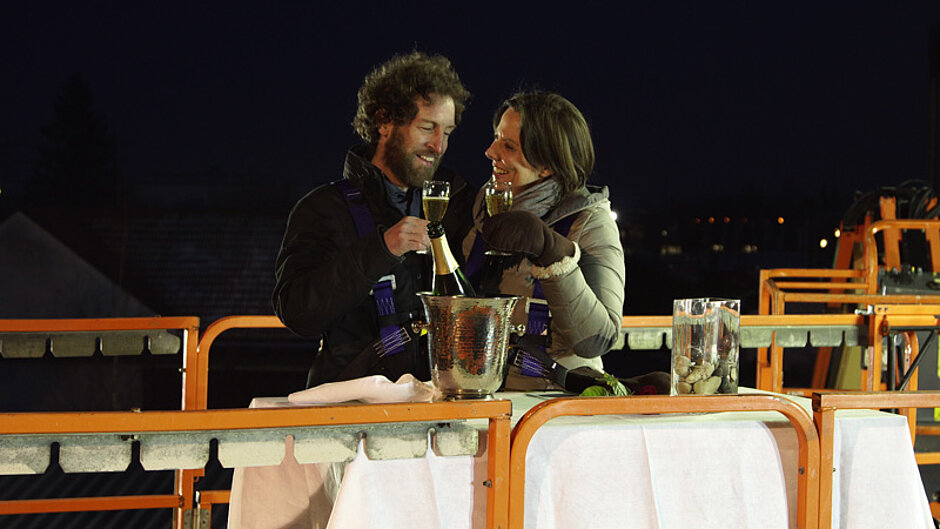 Zum gleichen Zeitpunkt überraschte Boyston Kristiansen in Tromsø (Norwegen) seine Freundin Lena Indrevoll mit einem Dinner in 43 m Höhe auf einem Arbeitsgerüst, das auf der Dachterrasse eines Hotels aufgebaut war. Eine Vertikalmastbühne brachte die Kellner mit dem 3-Gänge-Menü auf die richtige Höhe, während Bauheizungen für Wärme sorgten.