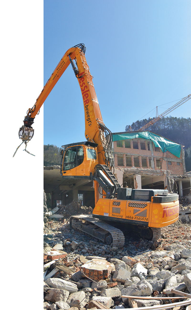 Kessler ist Pragmatiker, er suchte einen Bagger für Abbruch- und Tiefbauprojekte. Mit 2-m³-Löffel und der Möglichkeit, per Multischnellwechsler sämtliche im Abbruch verwendete Werkzeuge anbauen zu können, wurde ein langgehegter Wunsch wahr. Mit der Hyundai-Longfrontausrüstung bringt der Bagger 46 000 kg auf die Waage – kein Problem für den stabilen Unterwagen, der keiner Verstärkung bedurfte. »Die erste Longfront in Vorarlberg«, so Kessler, »sollte etwas besonders sein und die Zusammenarbeit bei dieser Multipurpose-Maschine mit unserem Hyundai-Partner hat sehr gut funktioniert«.